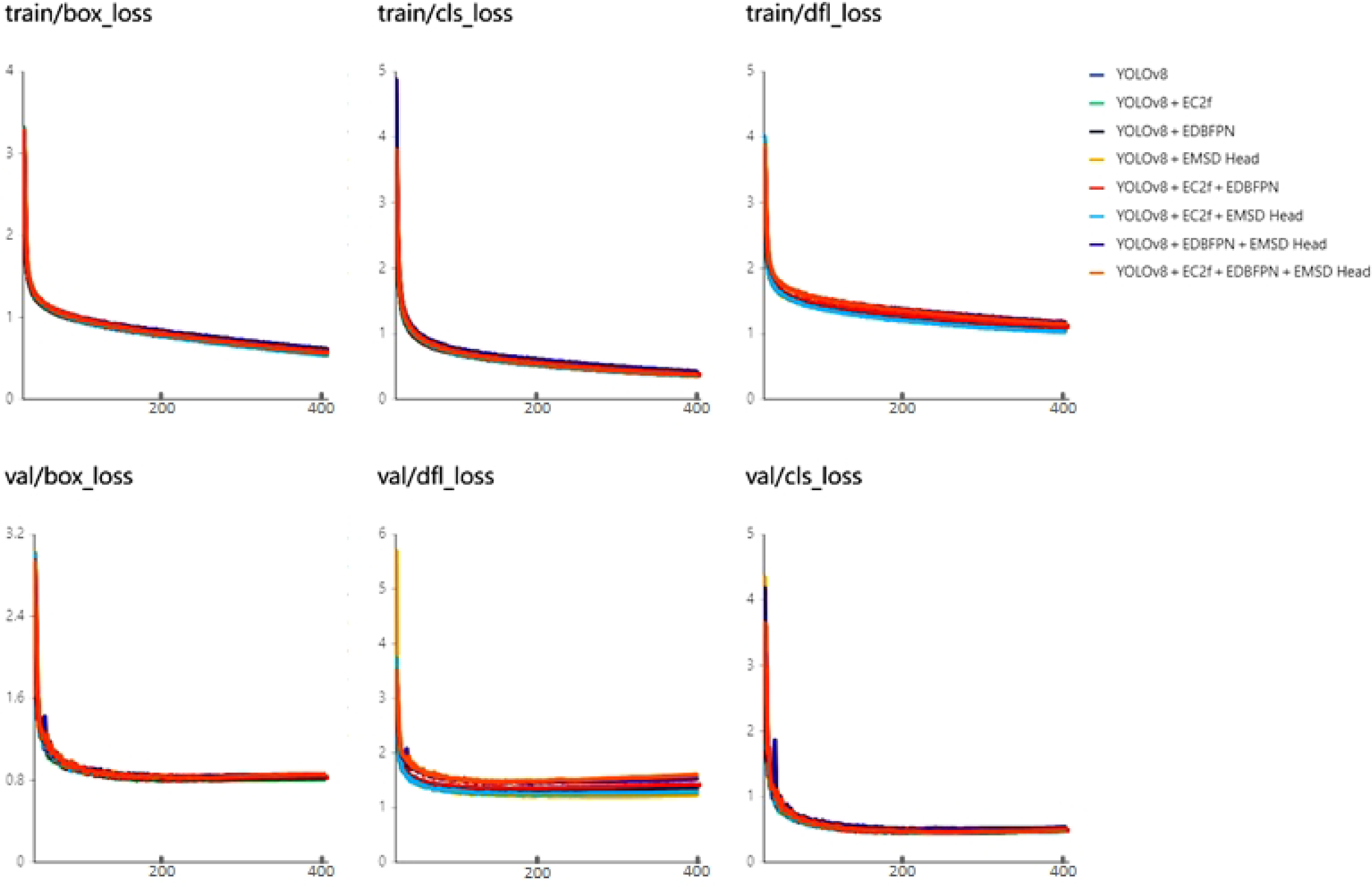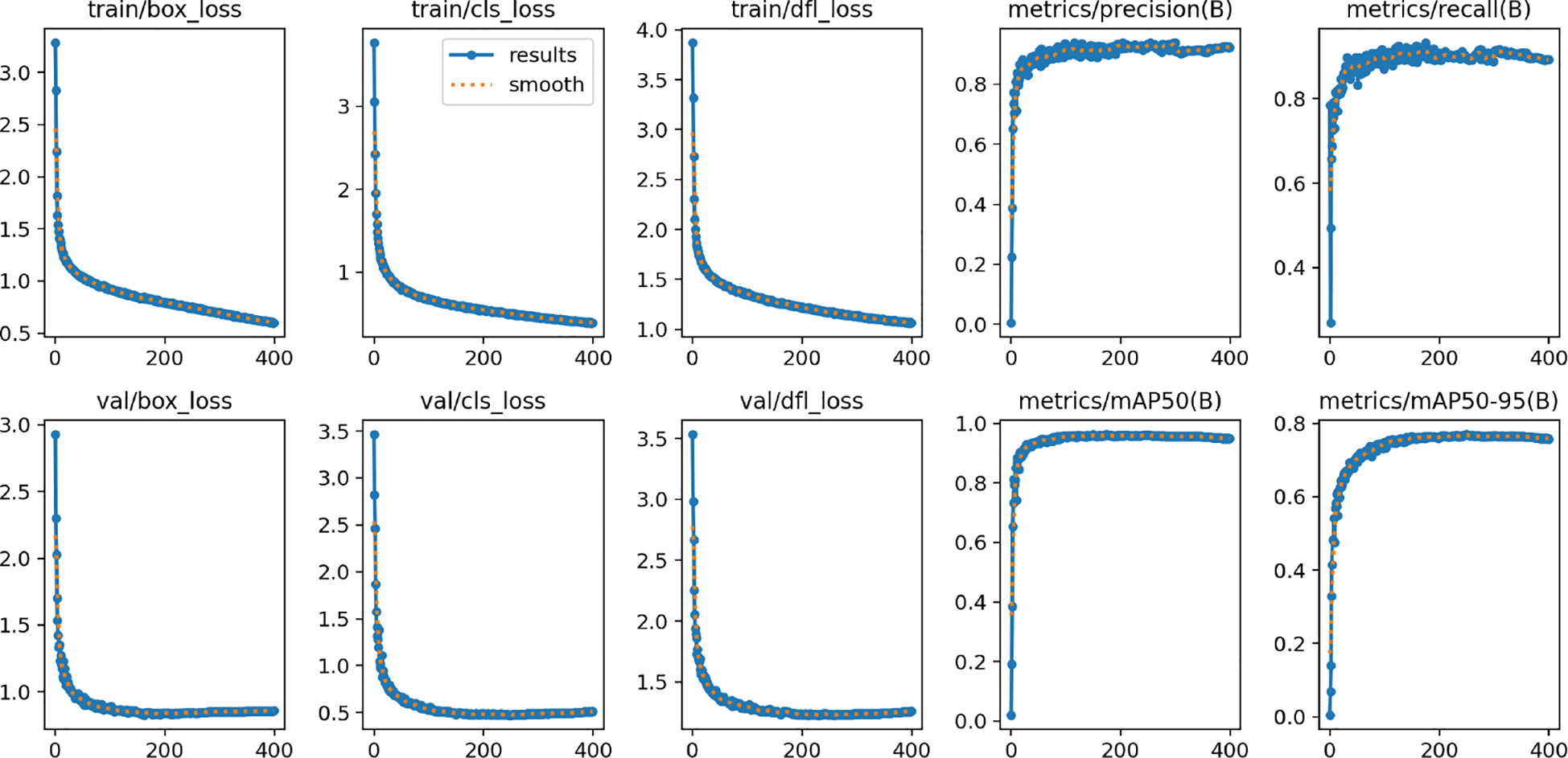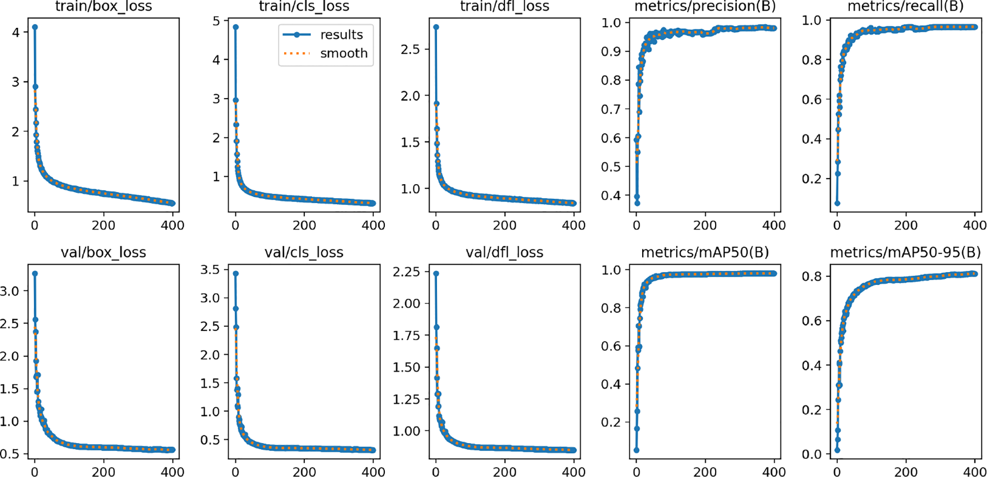 For model training and inference, we utilized Ubuntu 20.04.6 LTS, an AMD EPYC 7543P 32-Core CPU processor, and CUDA 12.0. The graphics processing unit (GPU) used was NVIDIA RTX A5000 with 24 GB of memory. The network development framework employed was torch-2.0.1+cu117. The integrated development environment (IDE) used was PyCharm. We set the epoch to 400, batch size to 16, and image size to 640 × 640. The optimizer used was stochastic gradient descent (SGD) with an initial learning rate of 0.01 and weight decay of 0.0005.