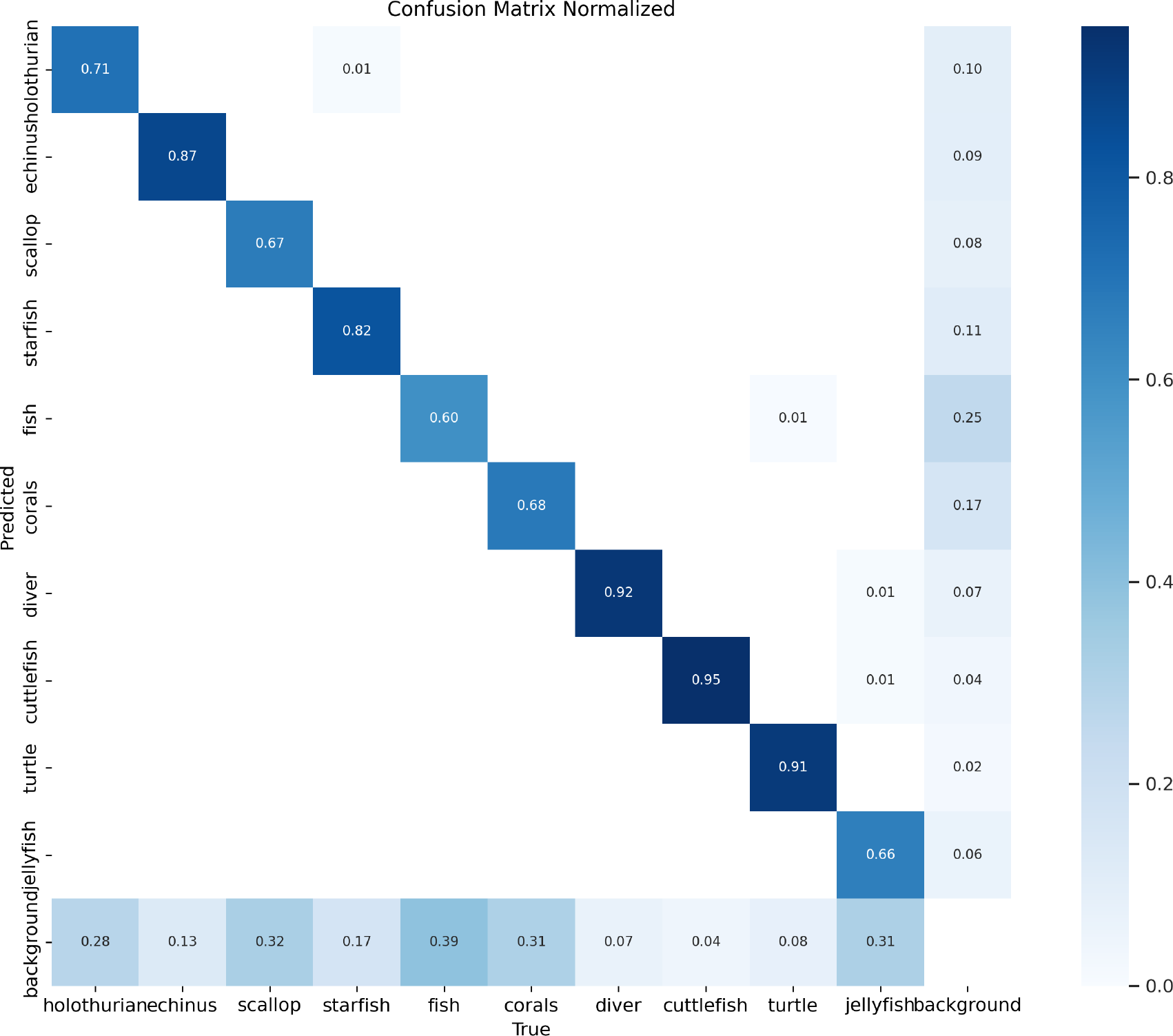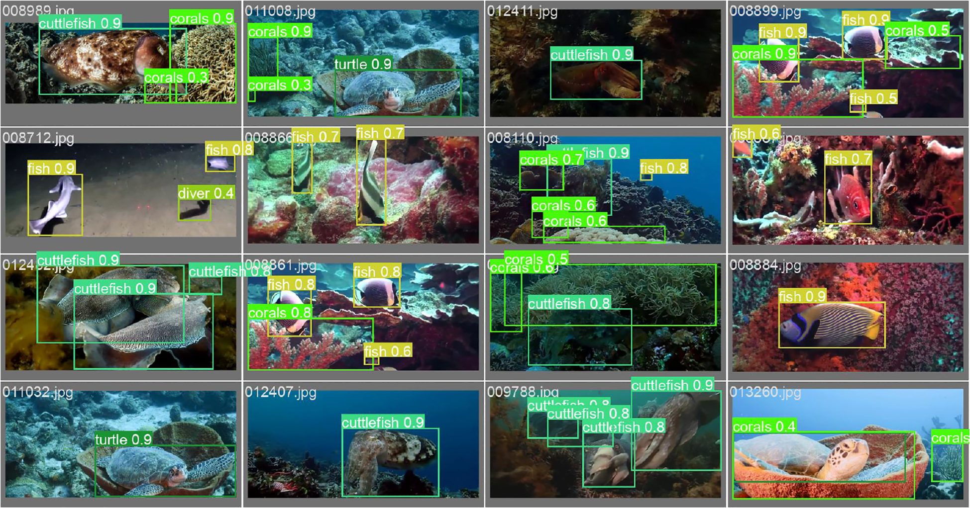 The RUOD dataset boasts a diverse array of target categories, ranging from schooling fish and diving humans to intricate marine flora and fauna such as starfish, vibrant corals, majestic sea turtles, spiny sea urchins, elongated sea cucumbers, bivalve mollusks like scallops, elusive cephalopods like squids, and ethereal jellyfish, cumulatively encompassing 10 distinct classes.