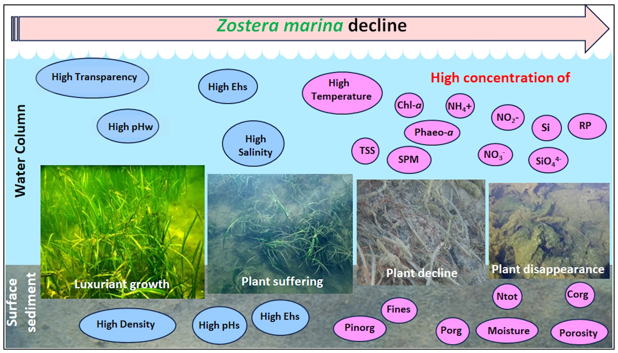 This study analyses the growth of Z. marina in a station where it forms a dense population and the presence/absence of this eelgrass throughout the entire lagoon to investigate both the environmental parameters and macroalgal variables that could affect its growth and its presence/absence.