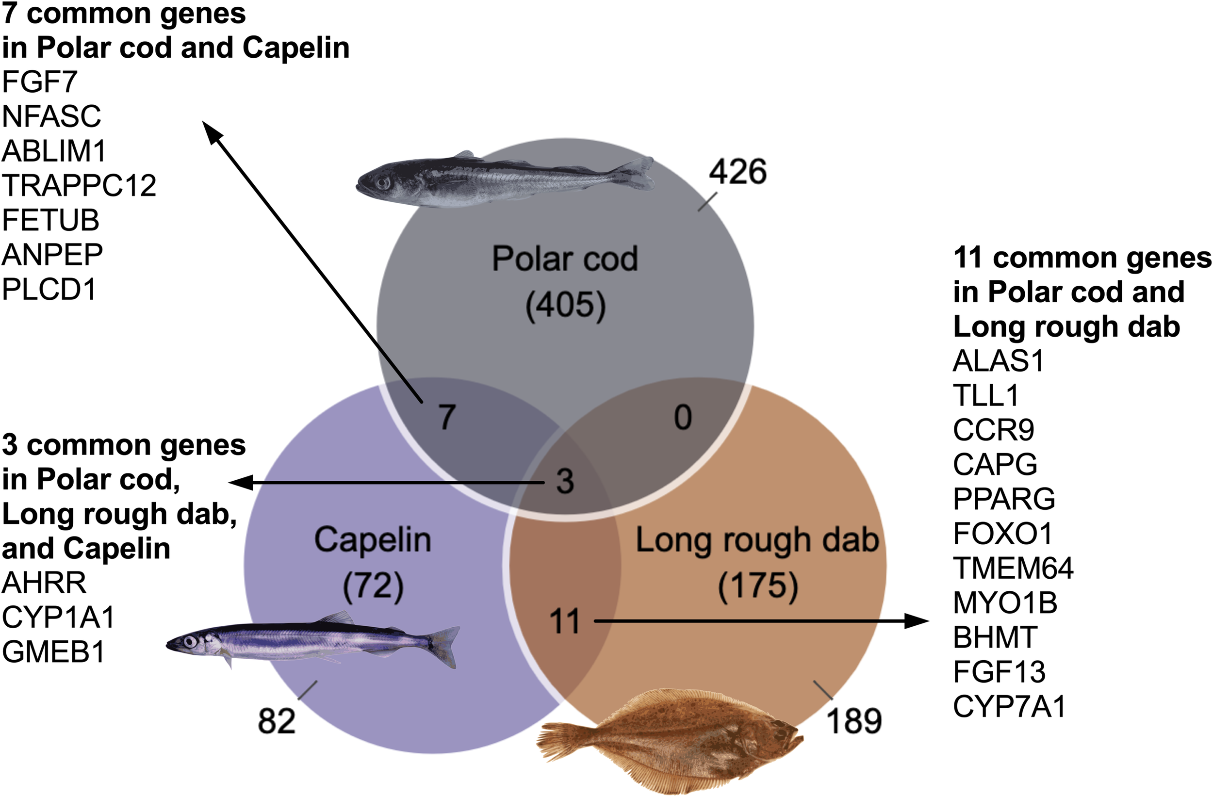 The Arctic and sub-Arctic cold-water environments are home to a wide array of fish species, many of which have both ecological and commercial significance. Among these species are the pelagic polar cod (Boreogadus saida) and capelin (Mallotus villosus) as well as the demersal long rough dab (Hippoglossoides platessoides). Polar cod and capelin are fish species in the arctic and sub-arctic food web, linking lower trophic levels to higher-level predators such as sea birds and marine mammals (Hop and Gjøsæter, 2013). While the Polar cod is an arctic species, capelin is the most abundant in sub-arctic regions (Hop and Gjøsæter, 2013). Long rough dab is a bottom-dwelling species that is among the most abundant in the Barents Sea of the sub-Arctic region (Walsh, 1996).
