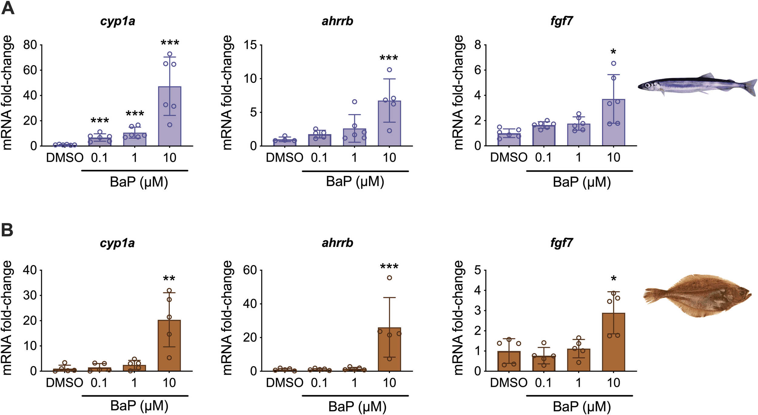 qPCR analysis of cyp1a, ahrrb, and fgf7 mRNA levels in (A) capelin (n = 6) and (B) long rough dab liver slices (n = 5) exposed to 0.1-10 μM BaP as indicated. Error bars indicate the mean ± SD of the individual values. Asterisks indicate significant differences to DMSO controls (*p < 0.05; **p < 0.01; ***p < 0.001).