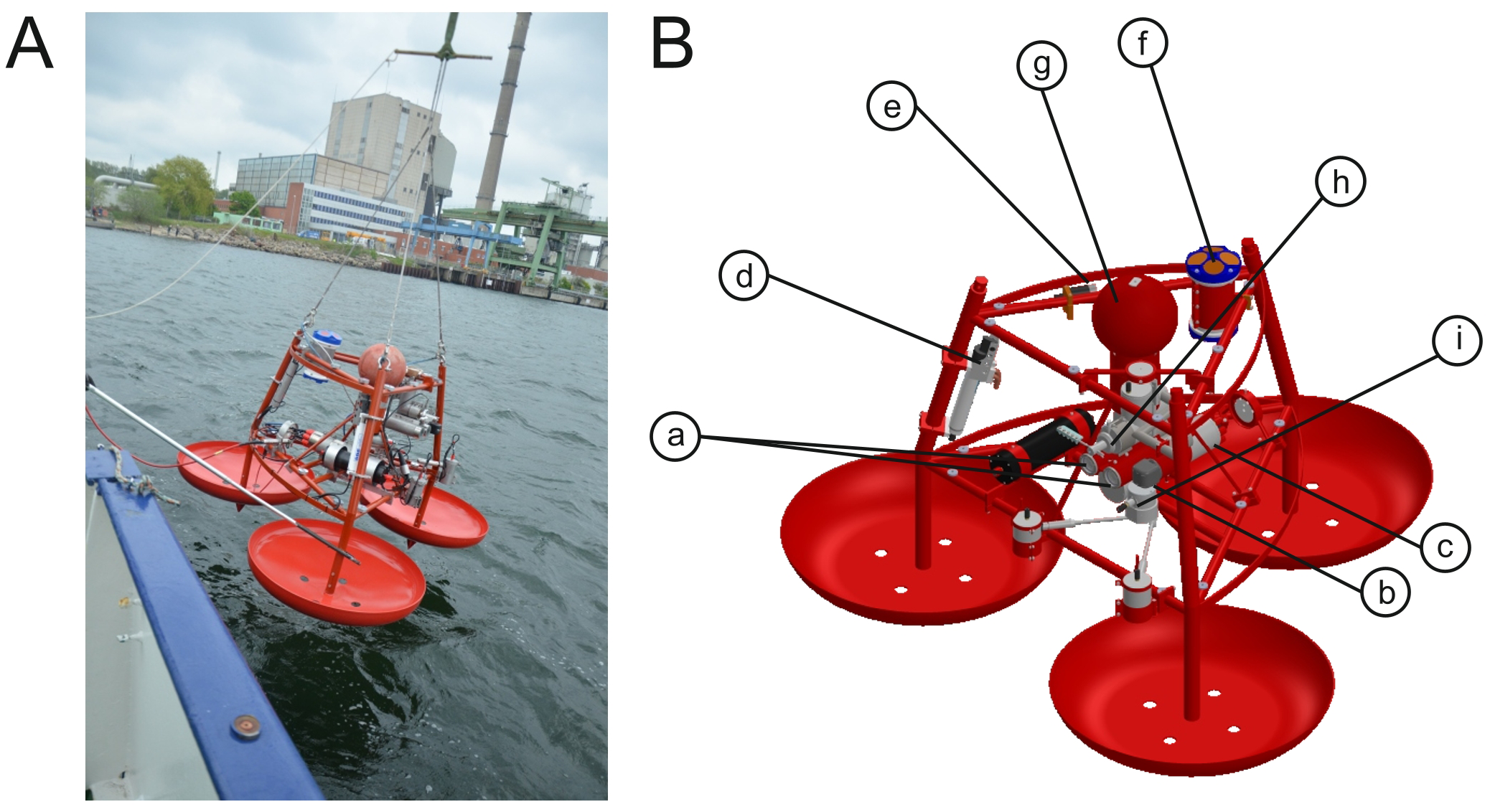 (A) The stationary UFO ready for deployment. (B) An annotated sketch showing the major components of the stationary UFO: (a) stereo camera system, (b) sonar, (c) multiplexer, (d) conductivity, temperature, depth sensor, (e) fluorometer, (f) acoustic Doppler current profiler, (g) recovery buoy, (h) wiper, (i) position sensor.