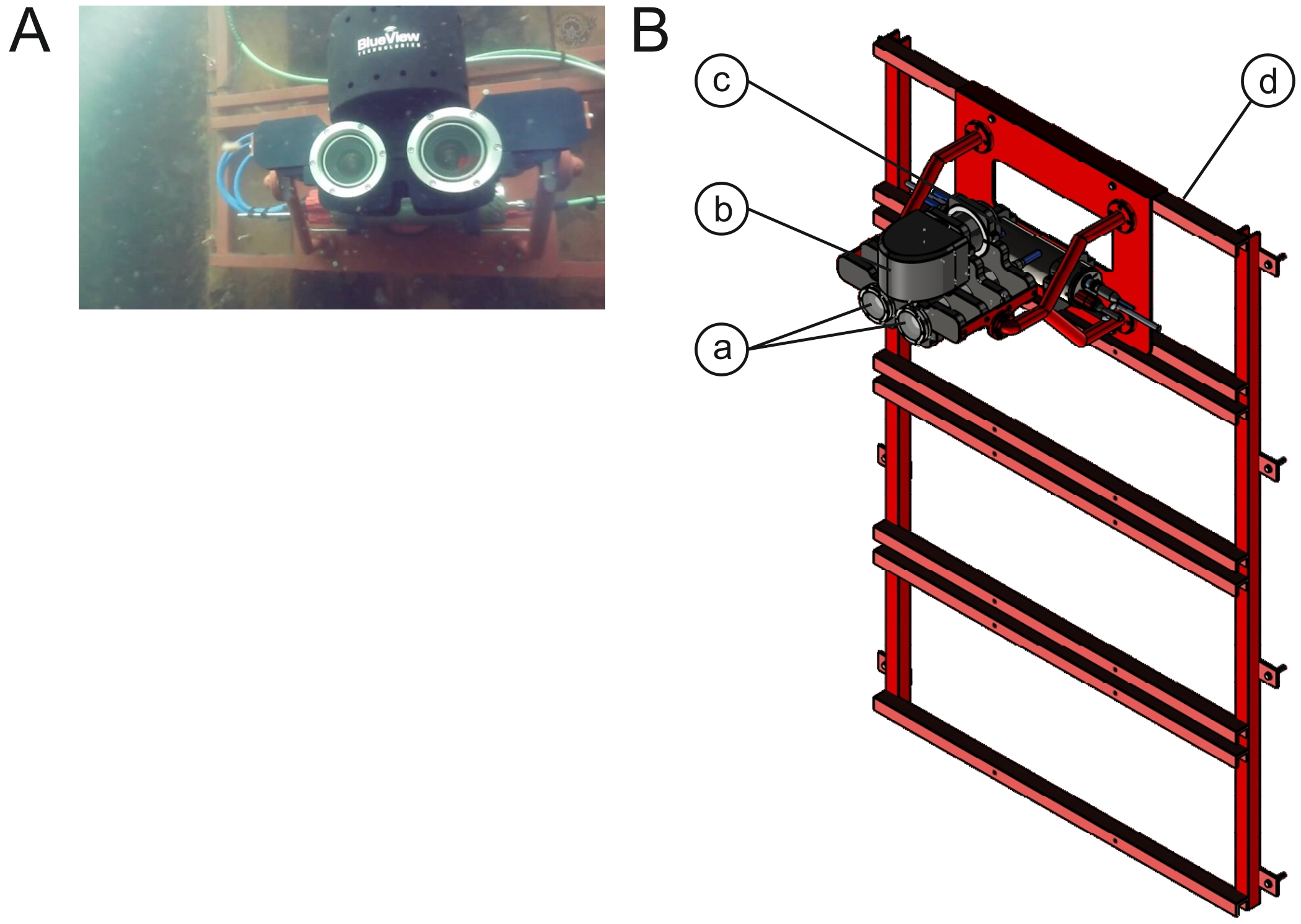 (A) The portable UFO attached to an underwater ladder assembly. (B) An annotated sketch showing the major components of the portable UFO: (a) stereo camera system, (b) sonar, (c) multiplexer, (d) ladder assembly.