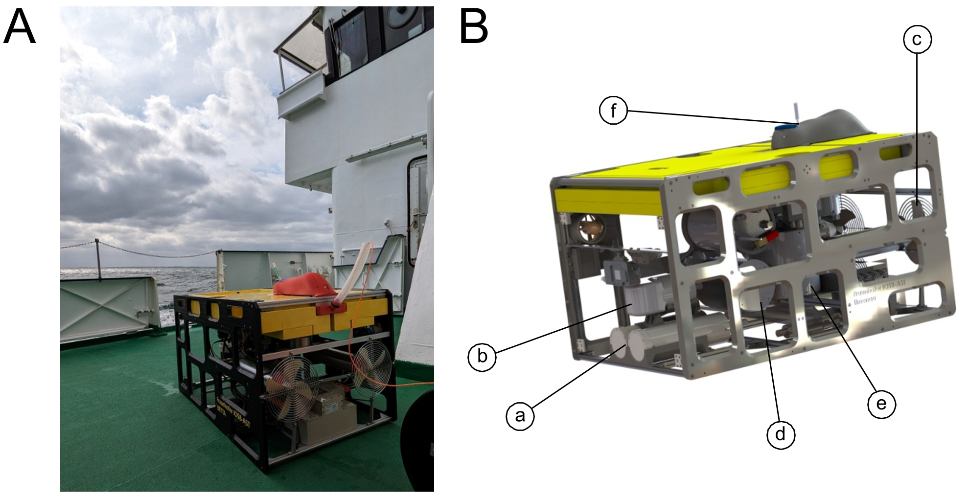 (A) The mobile UFO ready for deployment onboard the RV Littorina. (B) An annotated sketch showing its major components: (a) stereo camera system, (b) sonar, (c) main thrusters, (d) payload computer for real-time AI applications, (e) underwater navigation sensor with high accuracy, (f) communication module with wifi and USBL.