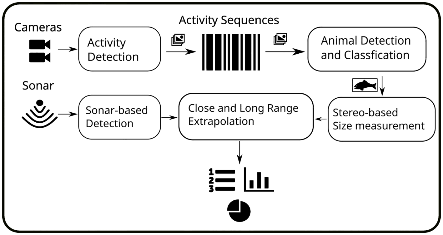 In the development of a novel method for the abundance estimation of fish, the strengths of the optical and acoustic systems were combined, a process referred to as hybridization. The camera images allow for the recognition of various marine species, including fish and jellyfish and comb jellies, enabling not only the counting of fish but also their specification. However, the effective viewing distance of the camera systems is constrained by underwater conditions to a realistic maximum of approximately 4 m. To overcome this limitation, sonar systems were employed. While sonar images do not provide the detail of optical cameras, they significantly expand the observation area. However, the resolution of sonar imagery is insufficient for species identification.