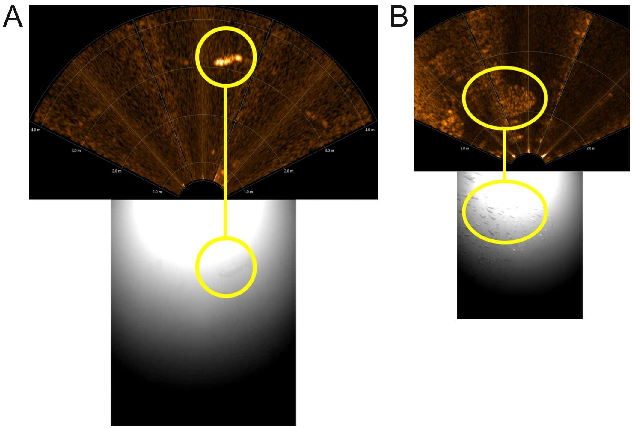 Comparison between sonar (upper panel) and video data (lower panel) showing (A) a single fish and (B) a school of clupeids.