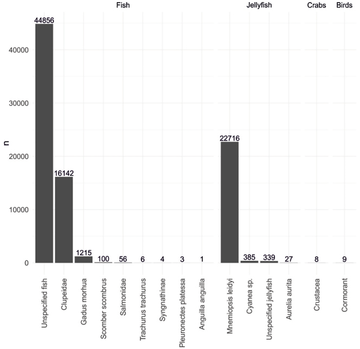 Western Baltic herring are pelagically schooling clupeids occurring in a size range of 20 – 32 cm in the Kiel Fjord area (Rudnick, 2022) and were the most detected fish species in the study area. The absence of herring and sprat from the end of October through November can be explained by the fish migrating to the overwintering areas, which are assumed to be in the region of the Kattegat and Øresund (Nielsen et al., 2001; Kvamme et al., 2003). Decreasing temperatures below 8–9°C also cause the young herring to move to deeper waters (Klinkhardt, 1996). The dominance of the ctenophores (Mnemiopsis leidyi) matches observations from previous plankton samplings showing a peak in plankton abundance during these months (Javidpour et al., 2006; 2009; Riisgård et al., 2012). The comb jelly was observed in the western Baltic Sea by Javidpour et al. (2006) for the first time in autumn 2006. As Mnemiopsis leidyi feeds primarily on zooplankton and to a lesser extent on ichthyoplankton of planktivorous fish such as anchovies, sardines and herring during their spawning period (e.g. Purcell et al., 2001), it mostly represents a potential food competitor of planktivorous fish and their larval stages. There is a fundamental risk that the intrusion of invasive species may permanently change the structure of marine ecosystems. For example, the introduction and mass spread of the predatory East American comb jelly Mnemiopsis leidyi significantly impacted the local zooplankton communities and led to the collapse of the anchovy stocks in the Black Sea and the Caspian Sea at the end of the 1980s (Zaitsev and Mamaev, 1997).