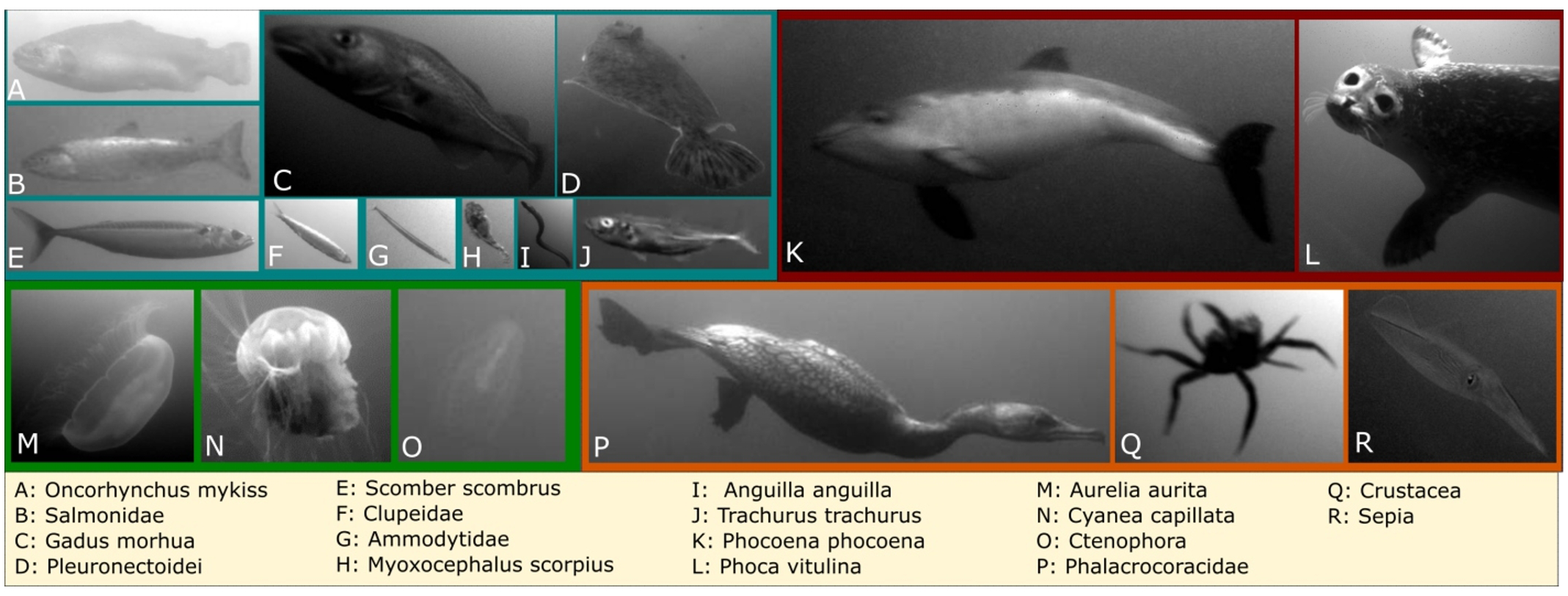 Many marine habitats and their biodiversity are under threat of climate change, discharges of pollutants, overfishing, habitat destruction, and invasive species (e.g., Halpern et al., 2008). Since the conservation and management of biodiversity requires knowledge of its components, status and trends, the temporally and spatially high-resolution UFO time series on the occurrence of individual key species can greatly improve the understanding of the status and trends of biodiversity components. This high-resolution UFO concept allows to monitor and analyse the development of marine biodiversity and the impact of environmental factors. With this novel observatory, we will not only focus on commercial but explicitly include non-commercial fish and other marine species in coastal areas, which are generally overlooked, even though they are known to play important roles in the ecosystem and also because they directly interact with commercial species, either as prey or predators. The species spectrum captured by the stationary UFO ranged from jellyfish, comb jellies, crustaceans and cephalopods to pelagic and demersal fish species, diving seabirds and marine mammals such as seals, porpoises and dolphins (Figure 10). In addition, biodiversity (Descriptor 1) is listed as one of the eleven descriptors of the Marine Strategy Framework Directive (MSFD).