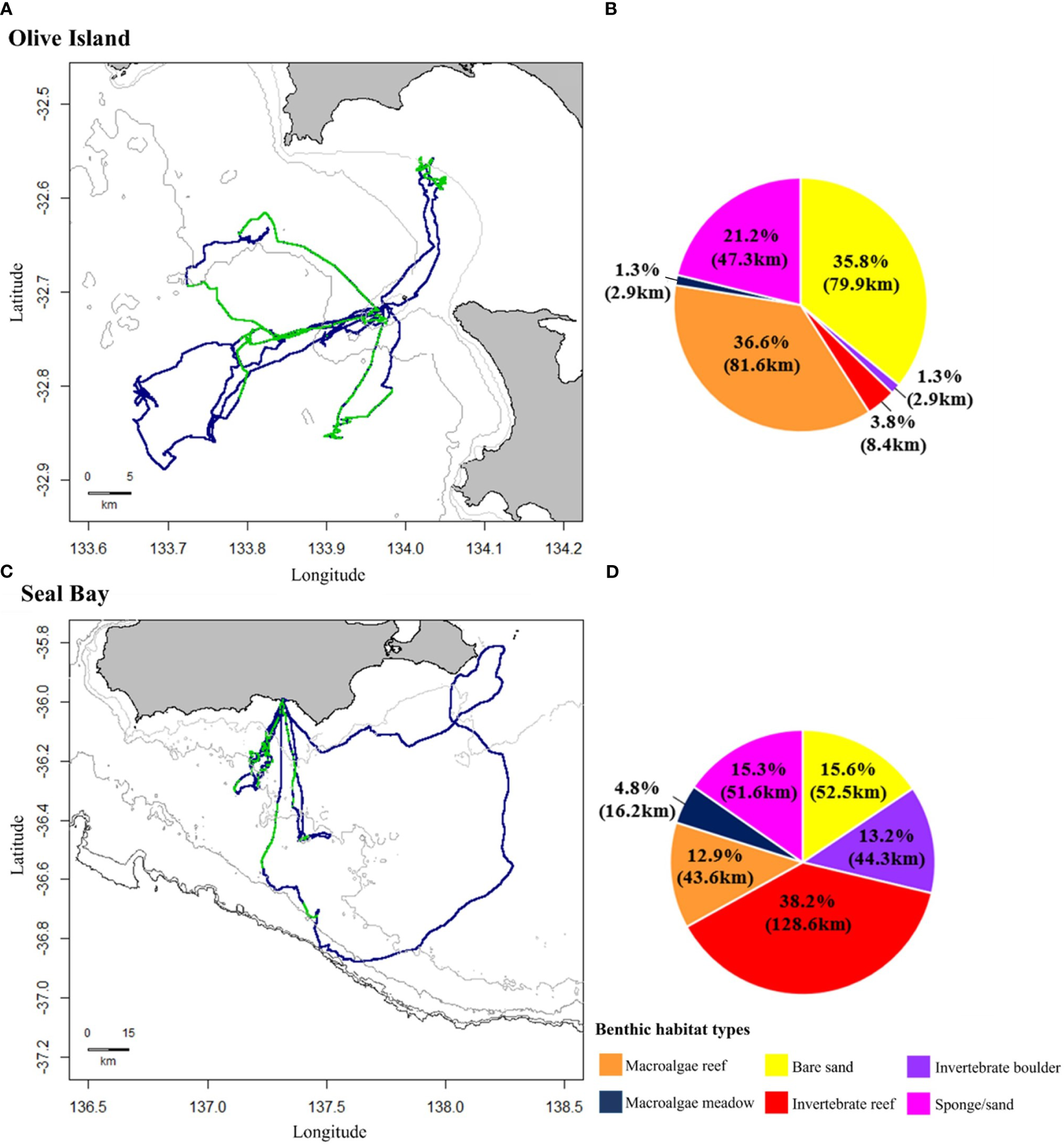 Movement and benthic habitat data from adult female Australian sea lions from Olive Island, western Eyre Peninsula (n= 4) and Seal Bay, Kangaroo Island (n= 4) in South Australia. Dead reckoned foraging paths represent at-sea movement in blue, with regions where animal-borne video data were available in green for sea lions from (A) Olive Island and (C) Seal Bay. Isobaths represent depth contours at 10, 25 and 50m for Olive Island (A) and 50, 75, 100, 150 and 200m for Seal Bay (C) (light to dark grey). Pie charts represent percent cover (km) of different benthic habitats on the foraging paths of sea lions from (B) Olive Island and (D) Seal Bay: macroalgae reef (orange), macroalgae meadow (navy), bare sand (yellow), invertebrate reef (red), invertebrate boulder (purple) and sponge/sand habitats (pink).