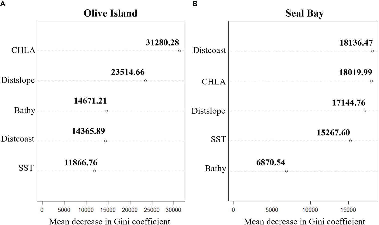 For Olive Island, a random forest model showed that chlorophyll-a and distance from the continental slope were the most important variables for predicting benthic habitat (mean decrease in the Gini coefficient= 31280.28 and 23514.66 respectively) (Figure 5A). For Seal Bay, distance from the coast and chlorophyll-a were the most important variables for predicting benthic habitat (mean decrease in the Gini coefficient= 18136.47 and 18019.99 respectively) (Figure 5B).