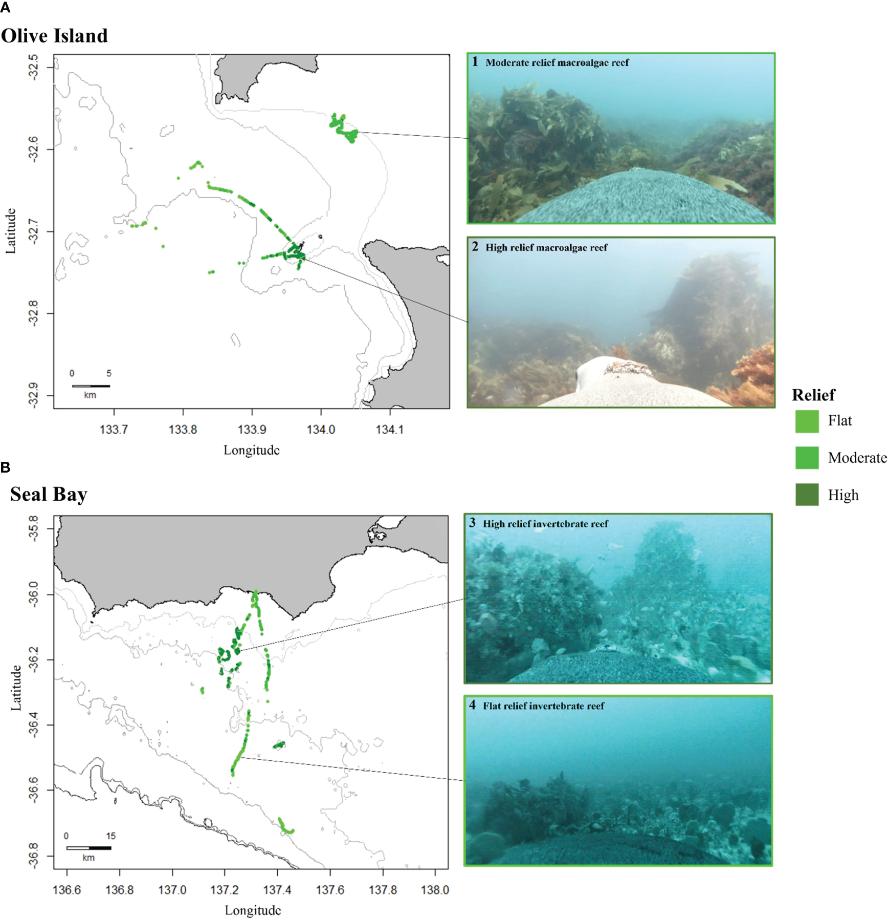 Distribution of reef habitats for (A) Olive Island, western Eyre Peninsula, and (B) Seal Bay, Kangaroo Island in South Australia. Maps show the distribution of flat (features <1m, light green), moderate (features 1-3m, green) and high relief reefs (features >3m, dark green), as identified from animal-borne video data from adult female Australian sea lions (n= 8). Isobaths represent depth contours at 10, 25 and 50m for Olive Island (A) and 50, 75, 100, 150 and 200m for Seal Bay (B) (light to dark grey). Examples of captured images are: 1) moderate relief macroalgae reef, 2) high relief macroalgae reef, 3) high relief invertebrate reef and 4) flat relief invertebrate reef.