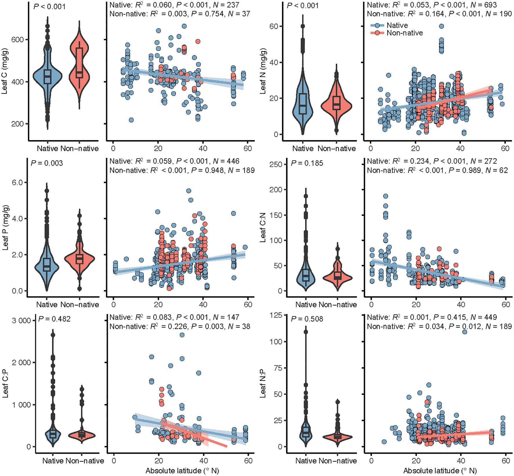 Leaf stoichiometry of native and non-native plant species in coastal wetlands and its relation with latitude. Panels, left side: leaf nutrient contents and stoichiometric ratios of native and non-native plant species, with box plots indicating the median and interquartile ranges and violin plots indicating distribution of the data with black dots outliers in the data set. The P-values indicate the significance of the effect of plant identity in linear mixed models. Panels, right side: linear regressions of the relations between leaf stoichiometry and latitude for native and non-native plants. When the latitude effect was significant, regression lines were plotted and associated R2, P-values and sample size (N) reported.