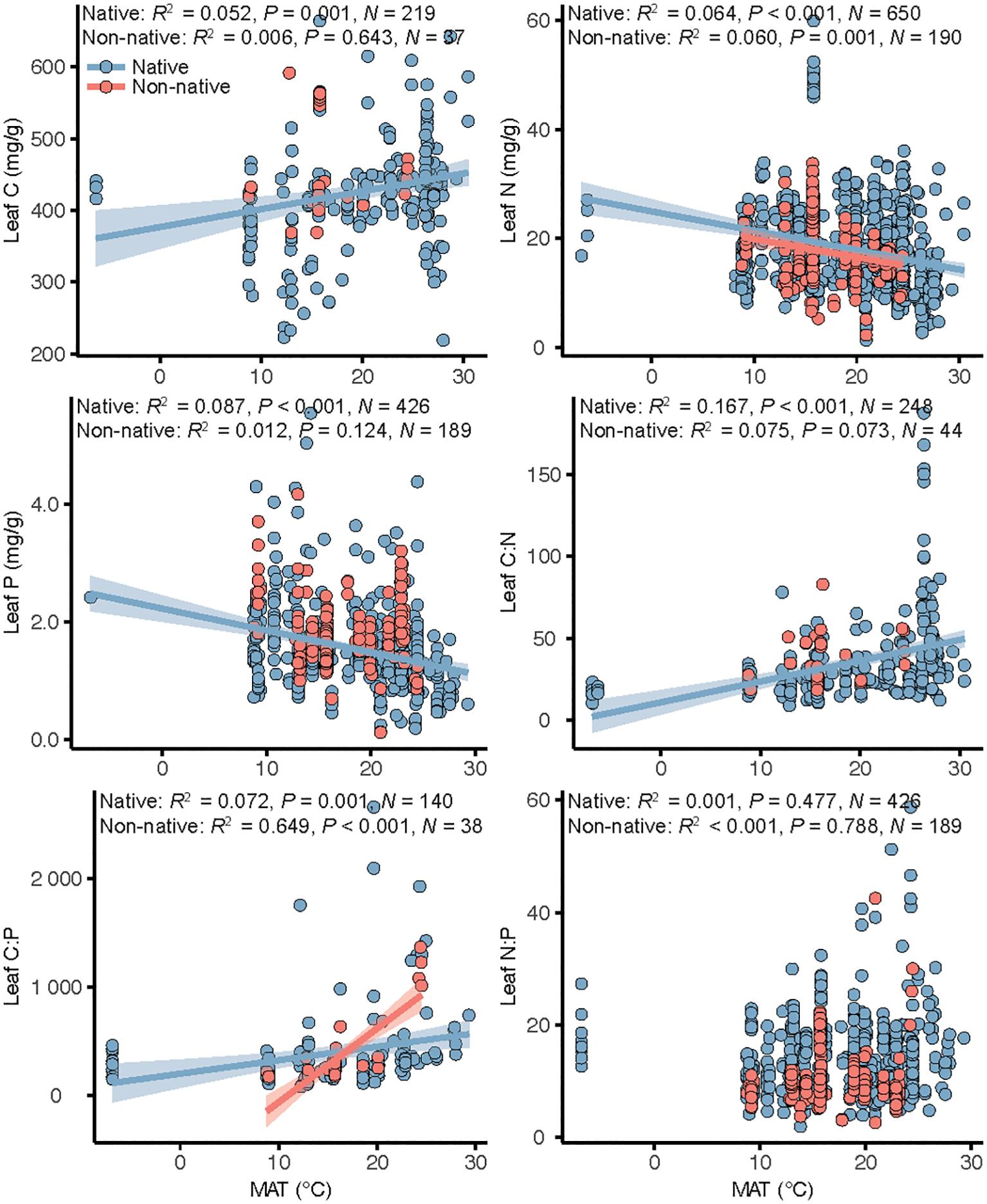Linear regressions of the relations between mean annual temperature (MAT) and leaf stoichiometry in native and non-native plants in global coastal wetlands. When the temperature effect was significant, regression lines were plotted and associated R2, P-values and sample size (N) reported.