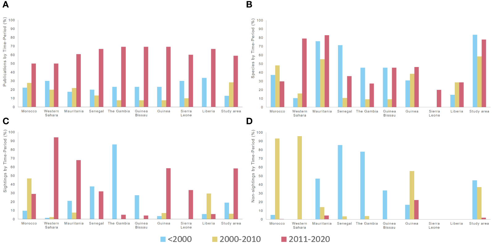 Only five sources — all reviews — provide data for the entire NWA (Morocco to Liberia), three of them published before 2000 (two of these on a single species) and two published between 2011 and 2020 (one for a single species). Among the sources covering the entire study area, Jefferson et al. (1997) reported the highest number of species (18 species, of which there are quantitative data on only 5), Weir and Collins (2015) reported the highest number of records (321 sightings), although targeting only S. teuszii, and only Jefferson et al. (1997) compiled non-sightings from multiple species, although reporting only 9 of such records (Appendix C.1). In the entire study area, the time-period with the highest percentages of the total number of species and the total number of non-sightings is the period before 2000 (Figures 1B, D, respectively), while the time-period with the highest percentage of sightings is 2011-2020 (Figure 1C).
