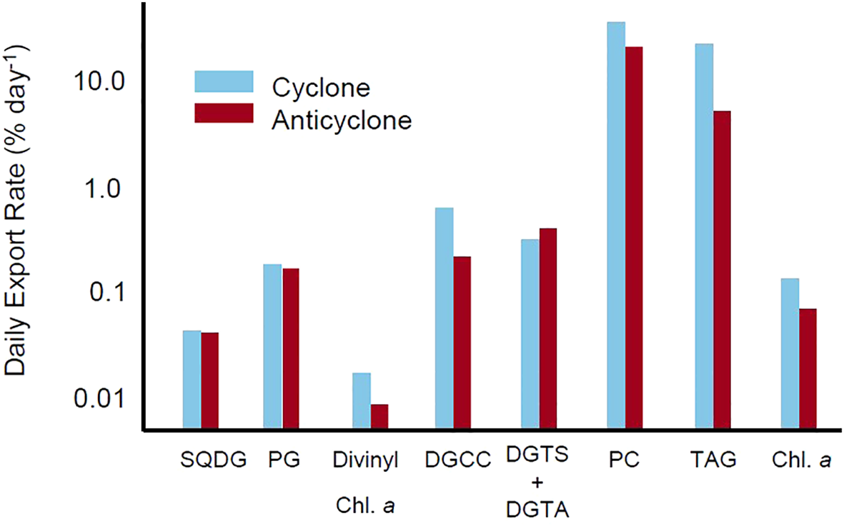 For each lipid class involved in calculating a stress response (SQDG, PG, betaine lipids, PC), the daily lipid export rate was calculated (Figure 5, see Methods). All cyanobacterial-associated lipids had low rates of export (<1% day−1). The export rate of divinyl chlorophyll a exhibited the lowest rate values, followed by SQDG and PG. The betaine lipids, which are associated with the eukaryotic BL: PC stress response signal, also had an export rate <1% day−1. Betaine lipid export rates were higher than cyanobacteria-associated lipid export rates, but lower than export rates of other eukaryote-associated lipids (PCs and TAGs). Both PC and TAGs exhibited high rates of export, with 19.1% to 32.9% and 4.7% to 20.6% exported each day from the anticyclone and cyclone, respectively. Both betaine lipids and lipids from cyanobacteria were exported slowly, regardless of eddy status. PC, associated with increased concentrations of phosphorus, and TAGs, which were associated with P-stress but are energy storage molecules, were exported rapidly from the euphotic zone. There was also a significantly greater total export of TAGs from the cyclonic eddy center as compared to the anticyclone (Supplementary Figure 4, Welch’s t-test, p = 0.036). While other lipid classes appeared to follow similar trends (i.e., PC), these differences were not significant (PC, p = 0.074; Supplementary Table 5).