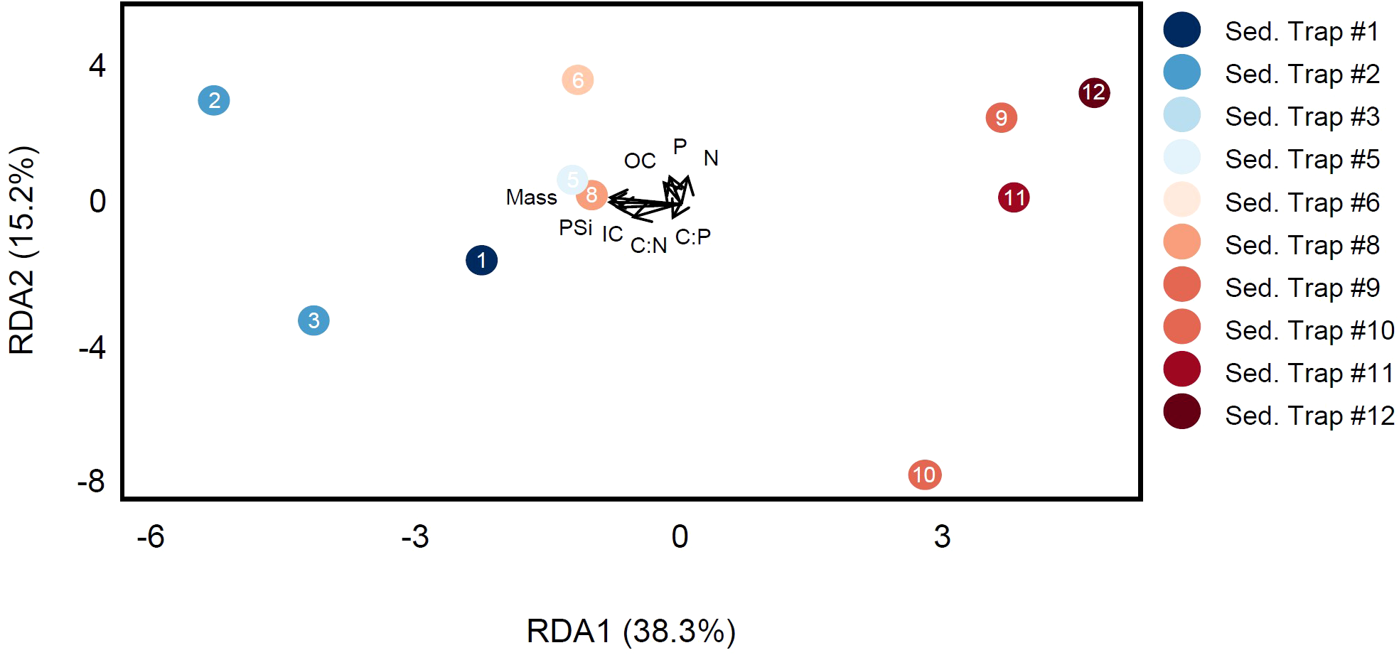 RDA of sediment trap lipidomes shows separation by eddy status along RDA1. Environmental flux data (units of mg m−2 day−1) were used as the explanatory covariate data matrix and included the flux of overall mass, biogenic silica (PSi), inorganic carbon (IC), organic carbon (OC), nitrogen (N), and phosphorus (P) although these factors were not significantly correlated in RDA space.