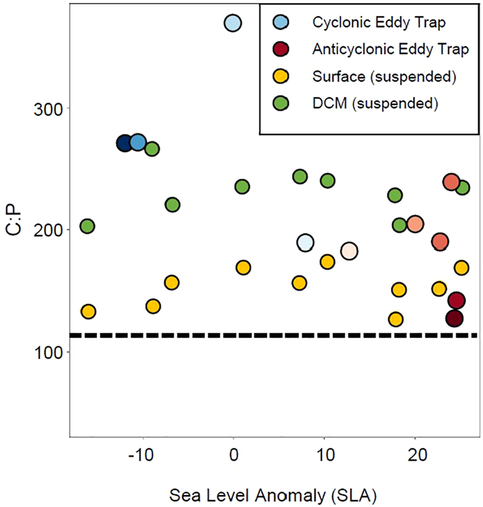 The C:P molar ratio of sediment trap lipidomes with water column lipidomes from the surface and DCM across the transect provided for context (full C:P of the water column across the transect found in Supplementary Figure 7). Sea-level anomaly is at the time of deployment for all sediment traps; blue to red shading corresponds to the colors for each trap shown in Figure 6. The dotted line represents the Redfield value for C:P of 106:1.