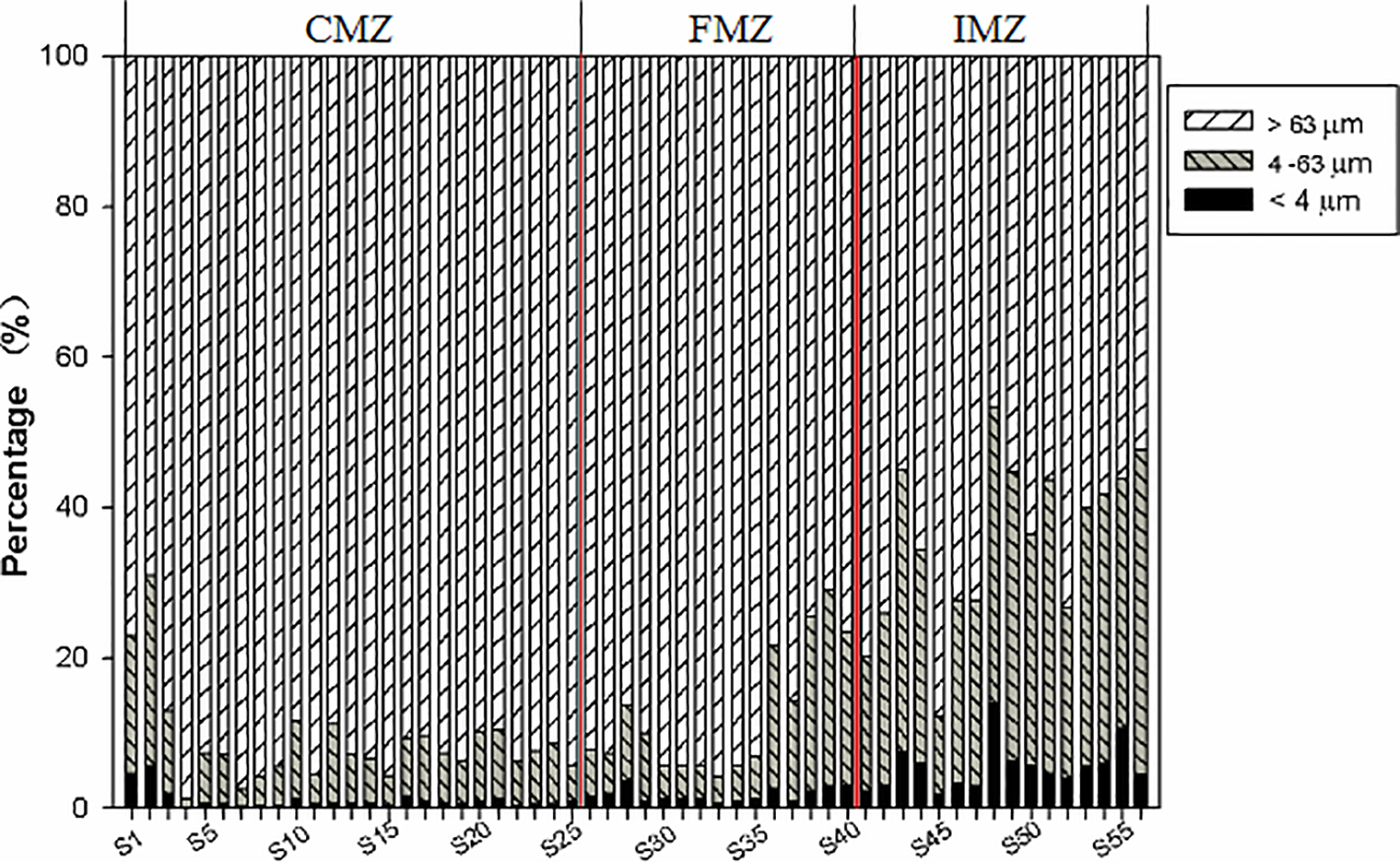 Mangrove ecosystems play a crucial role in sedimentary composition in coastal environments (Furukawa and Wolanski, 1996). The dense mangrove trees can effectively reduce wave energy and tidal flows and capture silt and clay. Low hydrodynamics in mangrove creeks may cause a higher fraction of fine sediments. Research has described that tidal currents decrease from bare flats through pioneer vegetation to interior mangroves (Van Santen et al., 2007). Because of the hydrodynamic attenuation and the ability of vegetation roots to combine sediments, fine fractions can accumulate in the interior mangrove. The fine fractions increased from the CMZ through the FMZ and to the IMZ, which indicated that mangrove ecosystems enhanced the accumulation of fine sediment grains. However, the ages of the native mangrove species of Aegiceras corniculatum in this study were less than 5 years, less able to capture more fine particles. This may be one reason why the fine fraction in the IMZ was lower than those in other researches (Xue et al., 2009; Zakaria et al., 2021; Zhang et al., 2021).