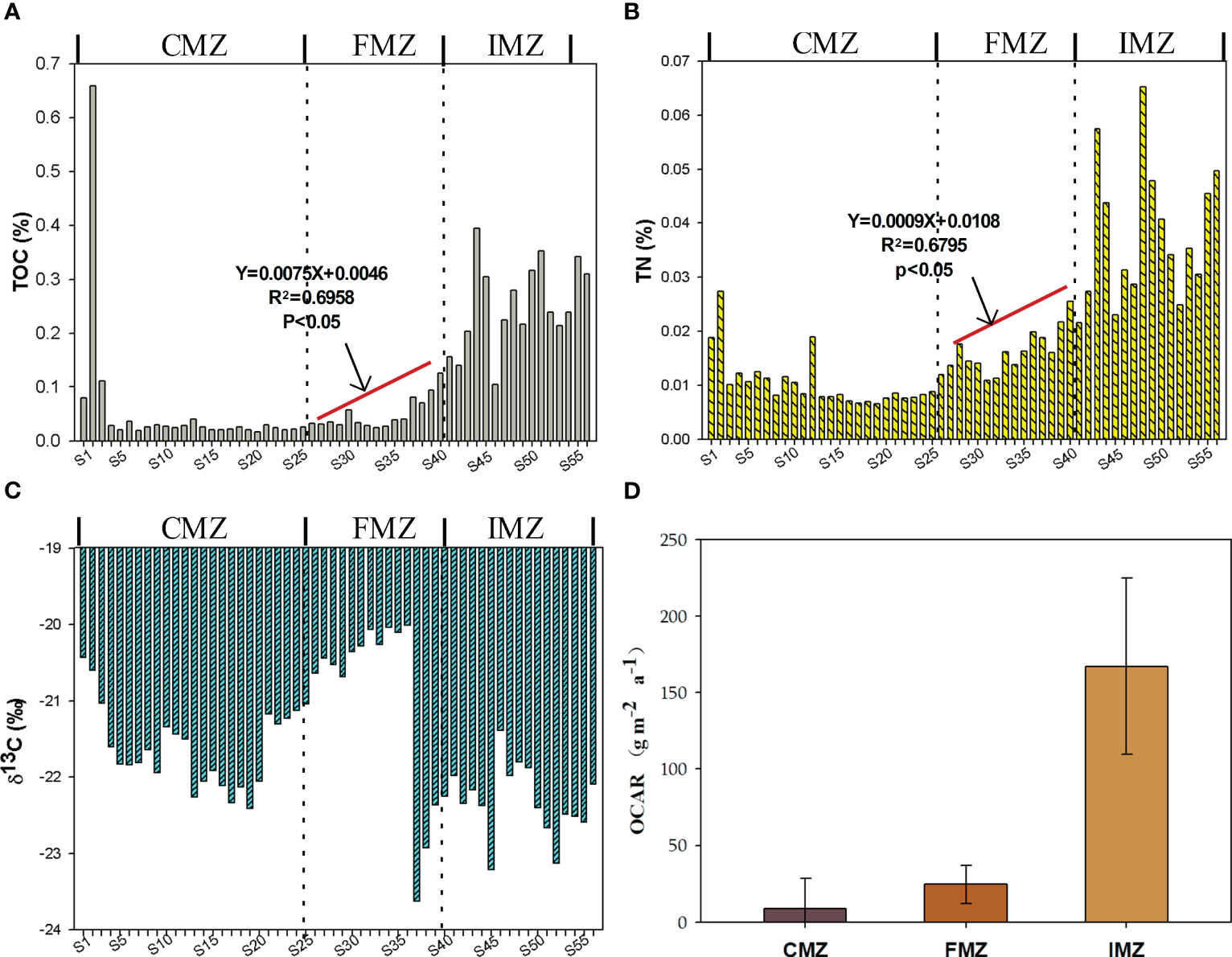The TOC and TN concentrations increased from the CMZ and FMZ to the IMZ (Figure 3), which may be directly influenced by fine fractions (clay and silt). This result suggested the capture ability for carbon and nutrient nitrogen together with the fine fractions of the mangrove ecosystem. The relationship among sediment composition, elemental and stable isotope composition is shown in Supplementary Figure S2. The TOC and TN contents increased as the fine fractions increased. This positive correlation pattern may be caused by the large surface areas and high adsorption capacity of the fine fractions (Loring and Rantala, 1992; Kumar et al., 2016). Obviously, there was a strong negative correlation between these contents and the sand fraction, indicating poor accumulation of this matter in the coarser fraction. The significant positive correlation between TOC and TN (p<0.001) suggested the probable same origin of these matter.