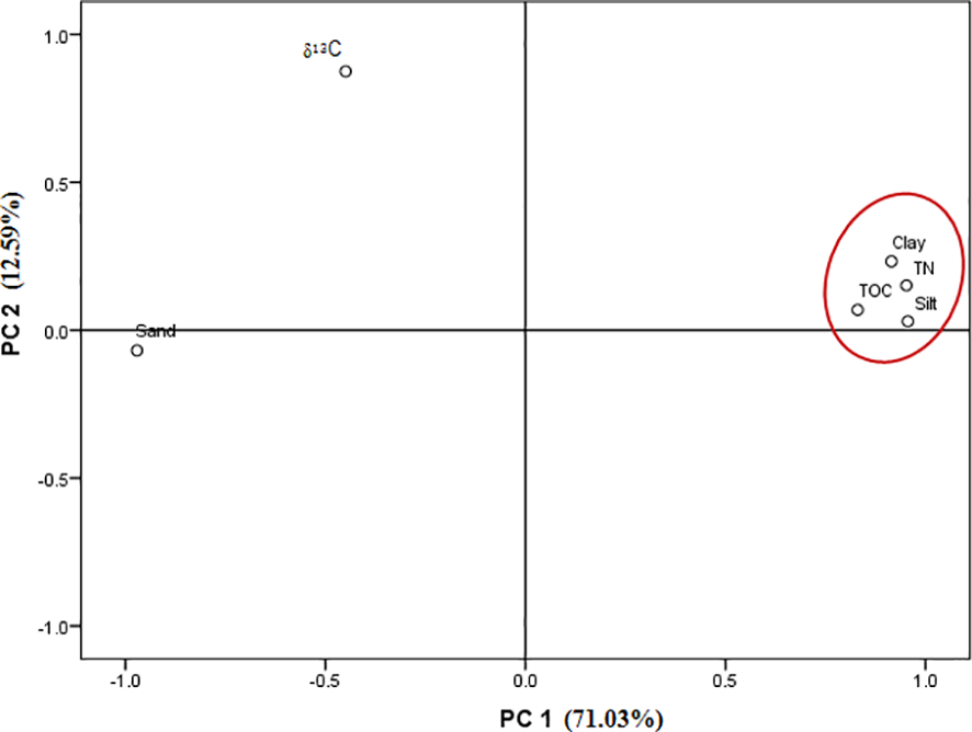 The significant component loading matrix of principal component analysis (PCA) is listed in Supplementary Table S1. The first two components accounted for 83.82% of the data variation (Figure 4). The first component (PC1) illustrated 71.03%, which showed a significant positive loading for clay, silt, TN and TOC, with a negative loading for sand. These results also supplied strong evidence for the increase of TOC and TN with the increase of fine fractions. The second component (PC2) accounted for12.59%, showing significant positive load for δ13C.