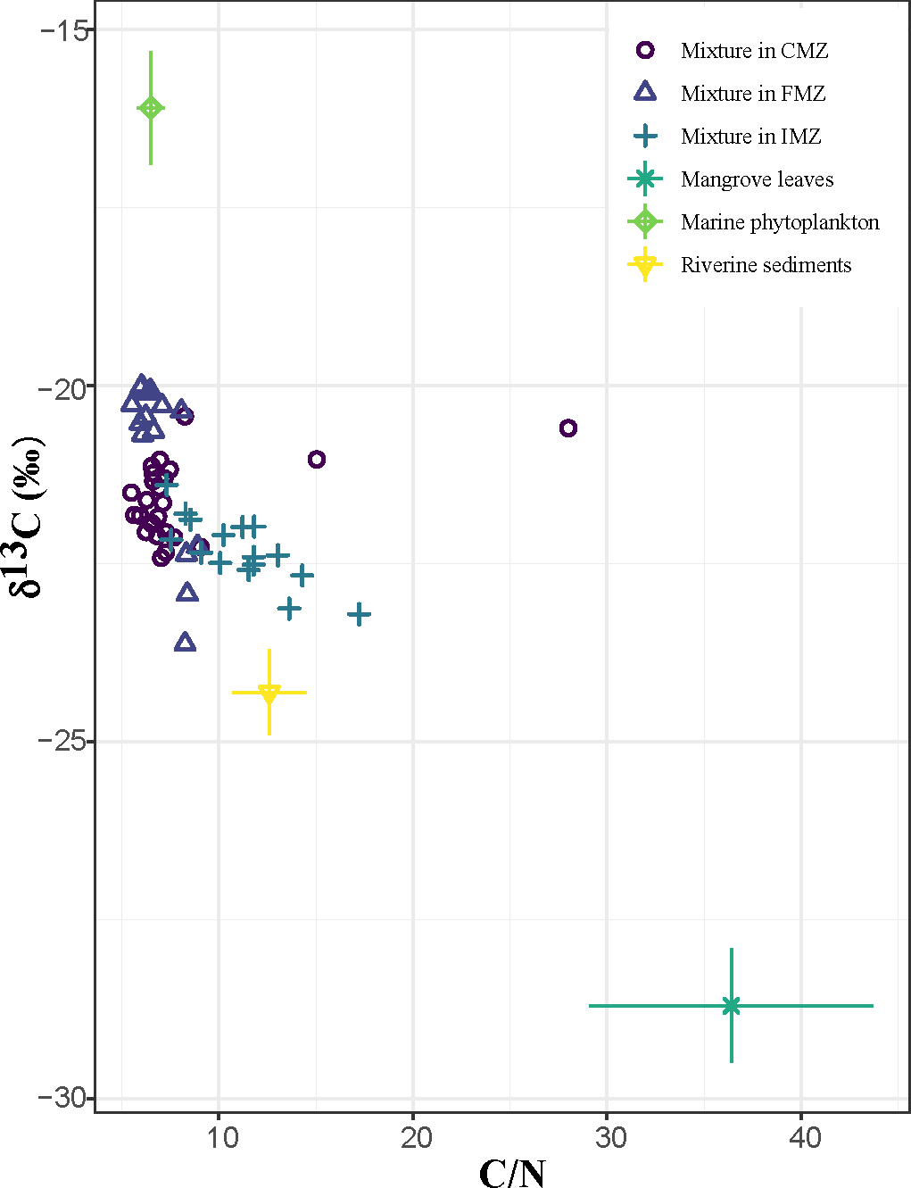 Tracer plot of δ13C and C/N (molar ratio) of sediments from the Nanliu River Delta and potential endmembers.