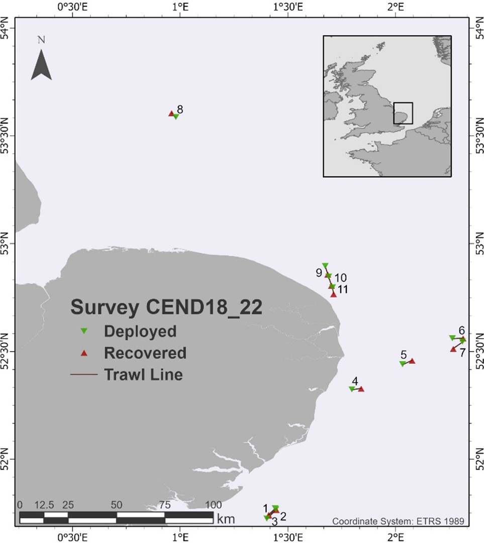 Location of the sampling sites (tows 1–11) off the East coast of England, UK during SmartBuoy (CEND18_22) survey using the Neuston microplastic catamaran.