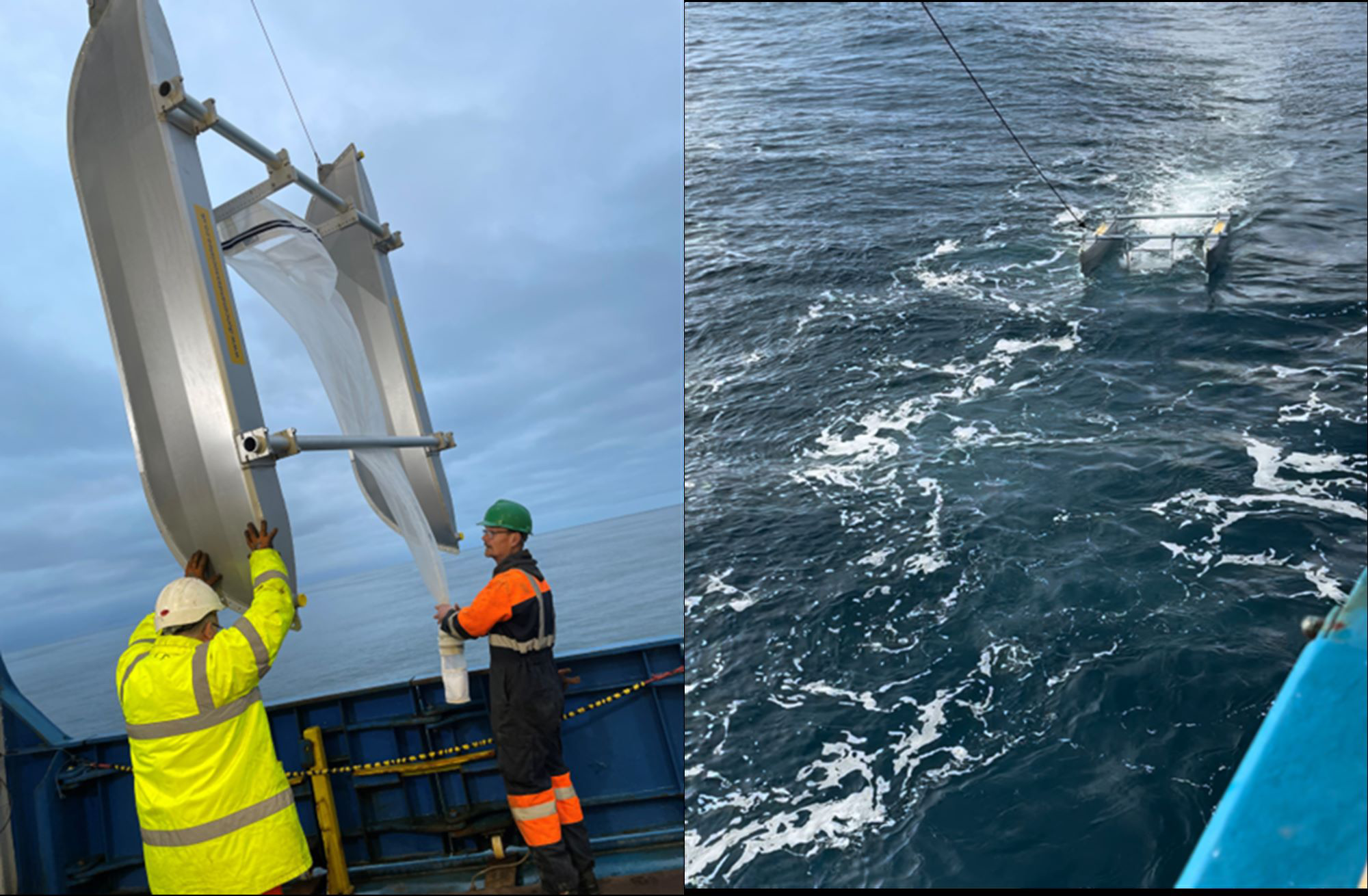 Microplastic catamaran, hulls with Neuston sampling net and cod end. Left: during deployment. Right: during towing.