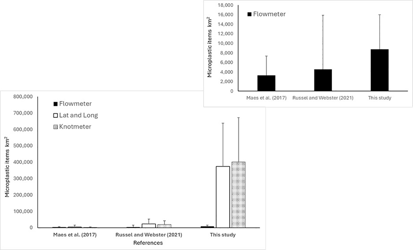 Comparison of microplastics per km2 ± SD of three regional studies calculated in three different ways. Flowmeter calculated using distance based on rotations. Latitude and longitude calculated distance based on coordinates. Knot metre calculated using distance based on onboard measuring speed. Inside: comparison of microplastics per km2 ± SD of three regional studies calculated using flowmeter.