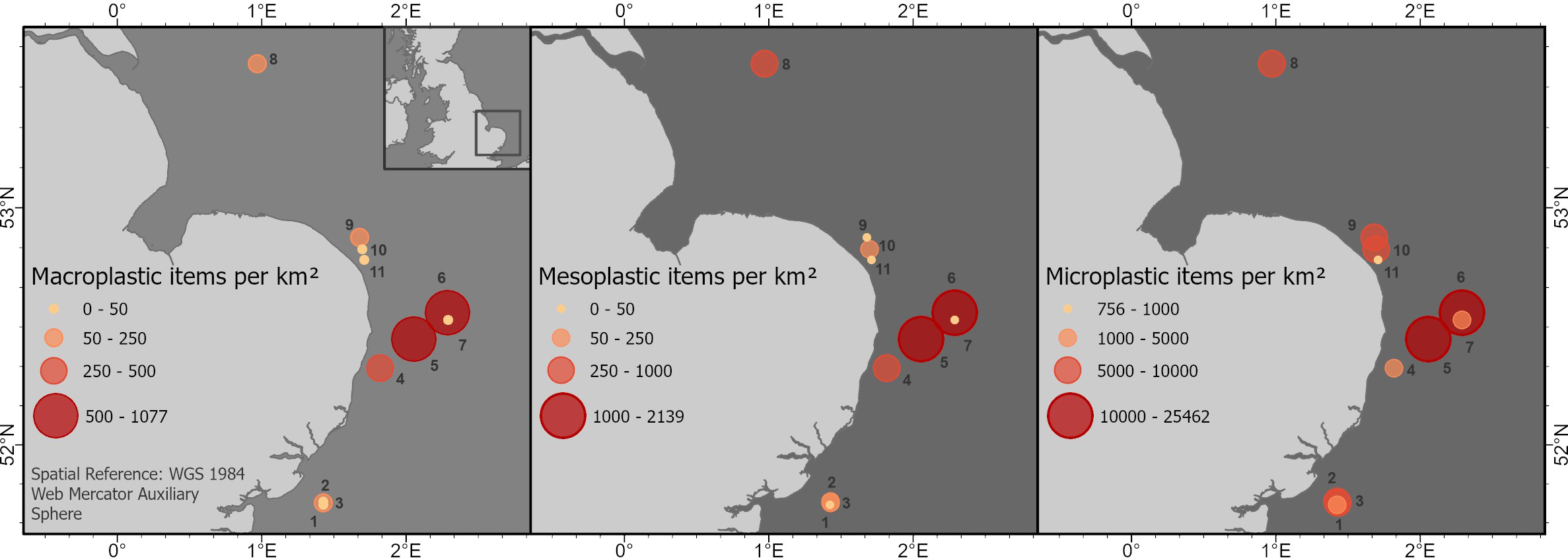 Mesoplastics concentrations ranged from 0 to 2,139 items km−2 with the highest abundances off the coast of East Anglia (stations 5 and 6), also a suspected hotspot for microplastics with substantially higher amounts of microplastics also being reported for that location (Figure 4). However, no statistically significant differences between the regions were found.