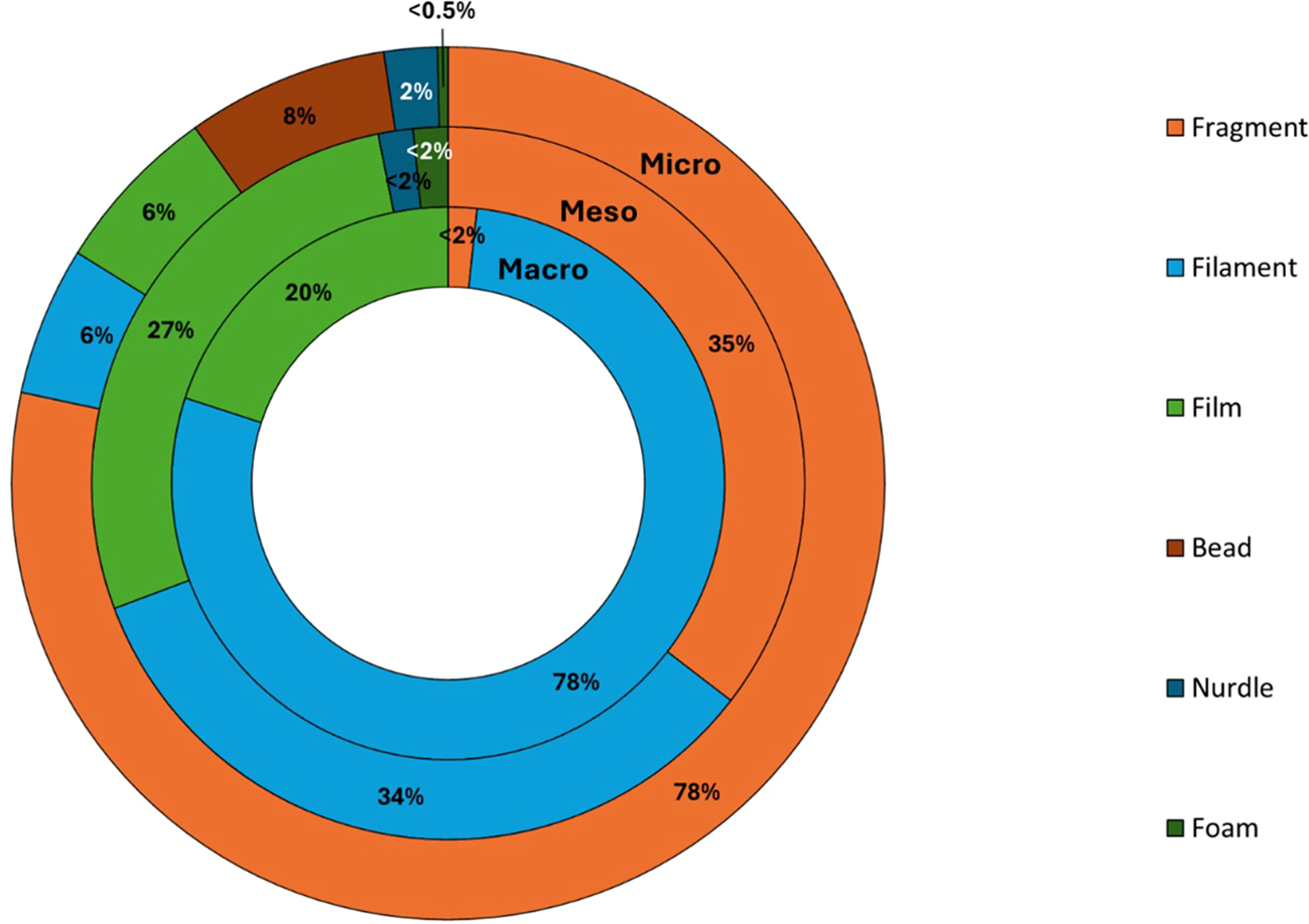 Macro- (>25 mm), meso- (5–25 mm), and microplastics (≤5 mm) were found at all samples under investigation (n=11) with a total of 2,526 litter items collected across all size categories. The abundance of floating plastic items increased with a decrease in size with 60 macro-, 125 meso-, and 2,341 microplastics (Supplementary Table S1).