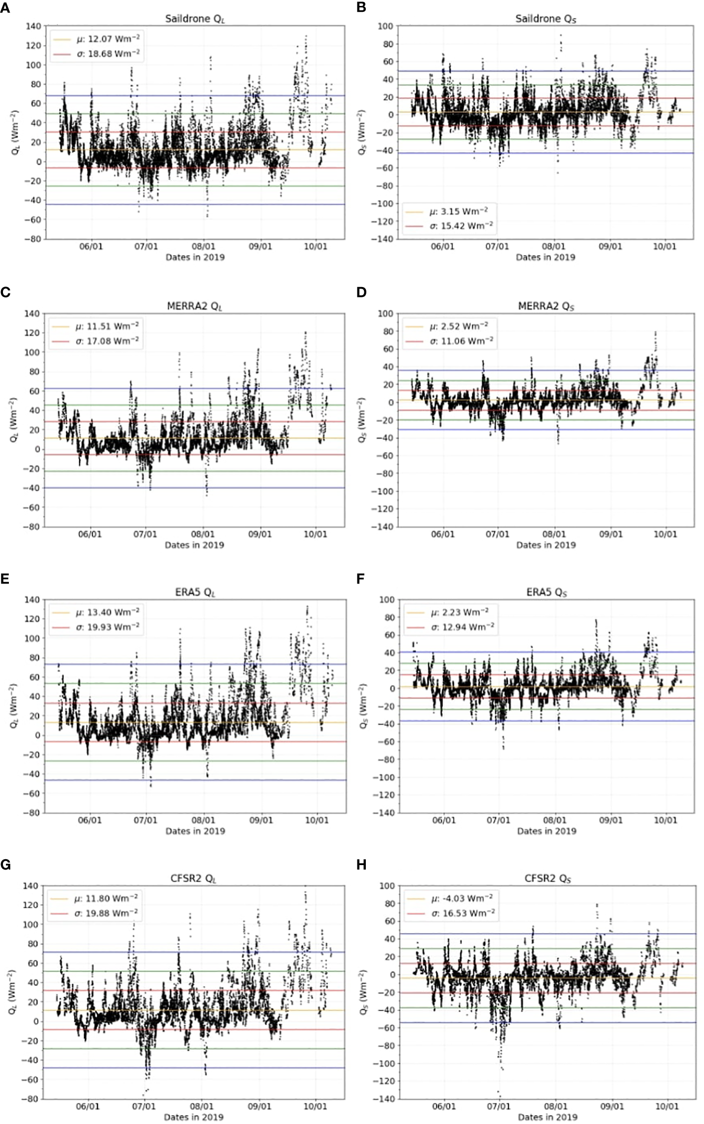 Figure 6 Discrepancies in latent heat fluxes (δQL, left column) and sensible heat fluxes (δQS, right) between observations and MERRA2 (A, B), ERA5 (C, D), and CFSR2 (E, F) in 2019 plotted as functions of time. Horizontal colored lines mark zeros (orange), ± 1 standard deviation (red), ± 2 standard deviations (green), and ±3 standard deviations (blue) of saildrone observations over the three years.