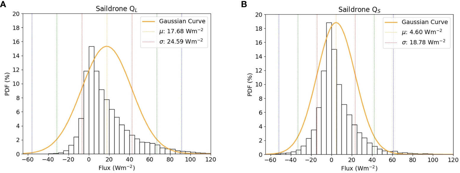 Figure 5 PDF of (A) QL and (B) QS from the saildrone observations of the three years. Solid curves are their Gaussian fits. Vertical lines mark the means (orange), and ±1 (red), ± 2 (green), and ±3 (blue) standard deviations.