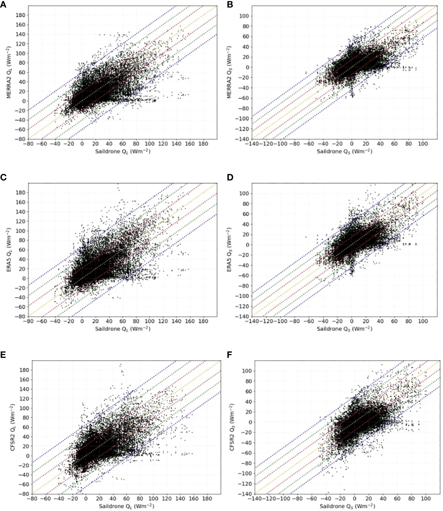 Figure 7 Scatter diagrams of QL and QS from the saildrone observations vs. MERRA2 (A, B), ERA5 (C, D), and CFSR2 (E, F) over the three years. Straight-colored lines mark the diagonal (orange), ± 1 standard deviation (red), ± 2 standard deviations (green), and ±3 standard deviations (blue) of saildrone observations.