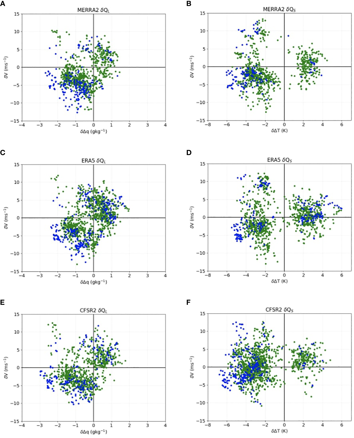 Figure 8 Scatter diagrams of δV vs. δΔq for large δQL (A, C, E) and δV vs. δΔT and large δQS (B, D, F) for the three reanalysis products. Colors represent |δQL| and |δQS| within observed 2 - 3 standard deviations (green) and greater than 3 standard deviations (blue).