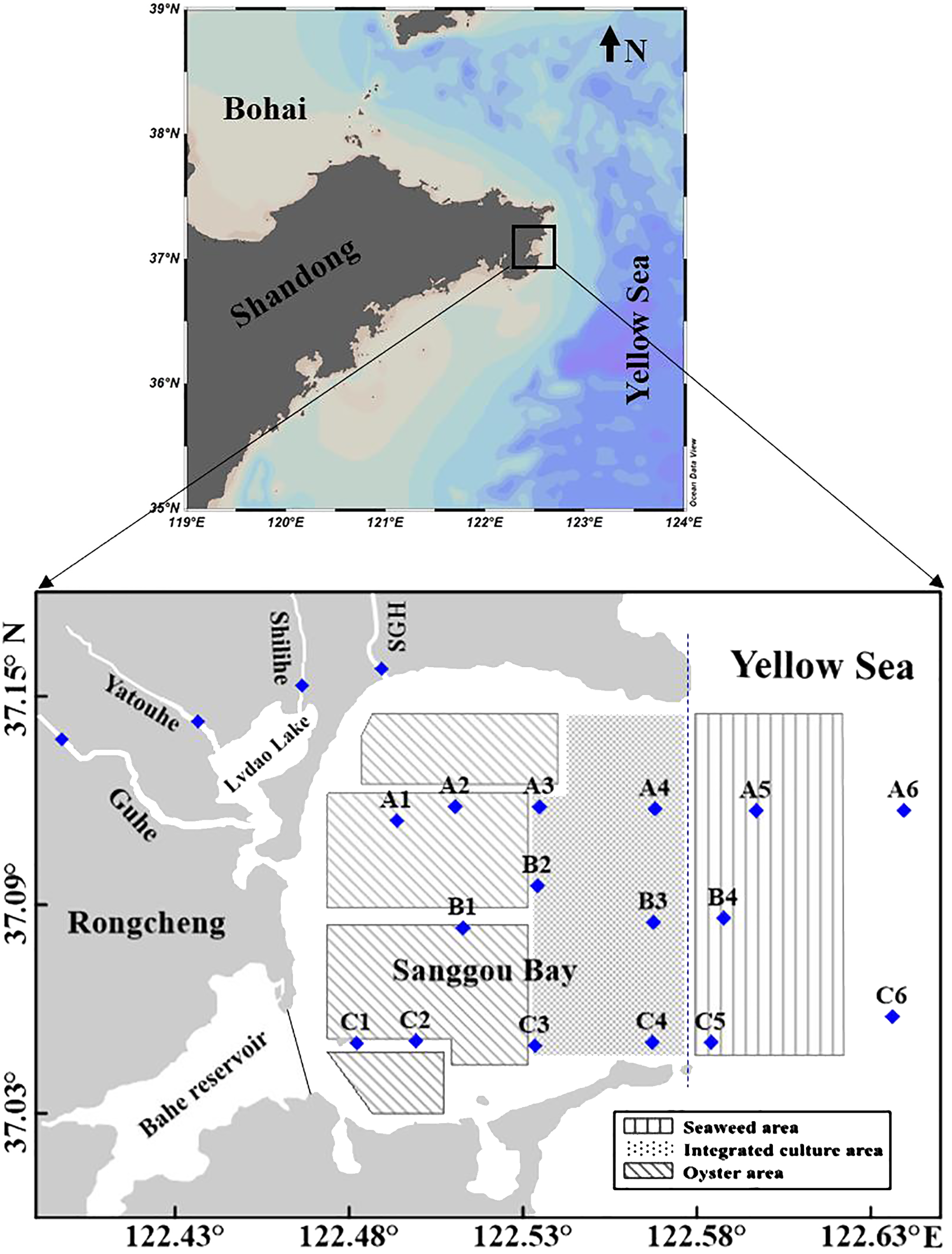 SGB, located in the eastern part of Shandong Peninsula (northern China) and connected to the Yellow Sea (YS), is a shallow bay (average depth of 7.5 m) and has an approximately area of 144 km2 (Figure 1) (Mao et al., 2006; Jiang et al., 2015; Li et al., 2016). The bay has a semi-diurnal tide regime, with an average tidal range of 2 m (Mao et al., 2006; Jiang et al., 2007). The regional climate is dominated by land-ocean climate (Kuang et al., 1996), with approximately 73% of annual precipitation in wet season (June–September) and 27% in dry season (from October to May). Rivers empty into SGB with annual total discharge 1.7–2.3 × 108 m3 yr–1 (China Gulf Chronicles Compilation Committee, 1991). The freshwater discharge is highly dependent on the monsoonal rainfall and varies from 0–0.95 m3 s–1 in dry season to 0–74.1 m3 s–1 in wet season (http://www.whsw.info.). The annual primary production of the bay was estimated to be 5.48 mol C m–2 yr–1 (Jiang et al., 2015). The productive period typically extends from early May to late September.