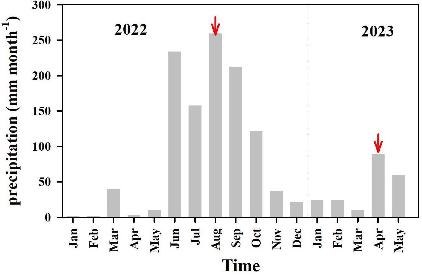 Monthly precipitation during 2022−2023 in Rongcheng city. Precipitation data were obtained from http://www.whsw.info. The red arrows pointed to the sampling month.