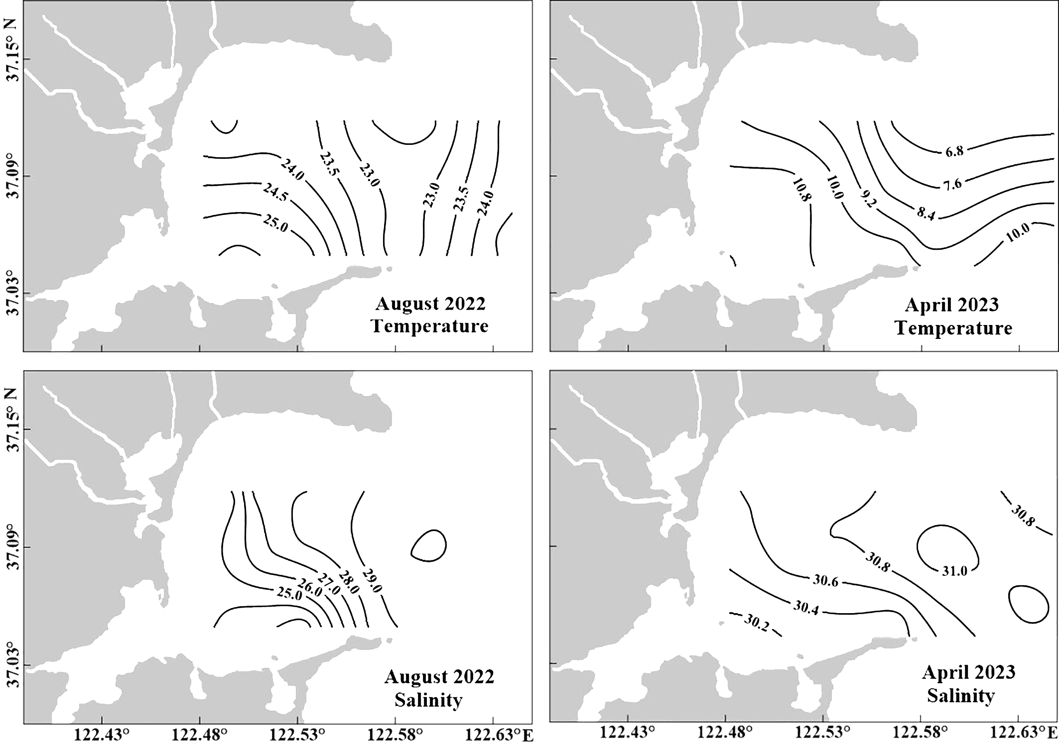 Horizontal distribution of temperature (°C) and salinity at the surface in SGB in August 2022 and April 2023.