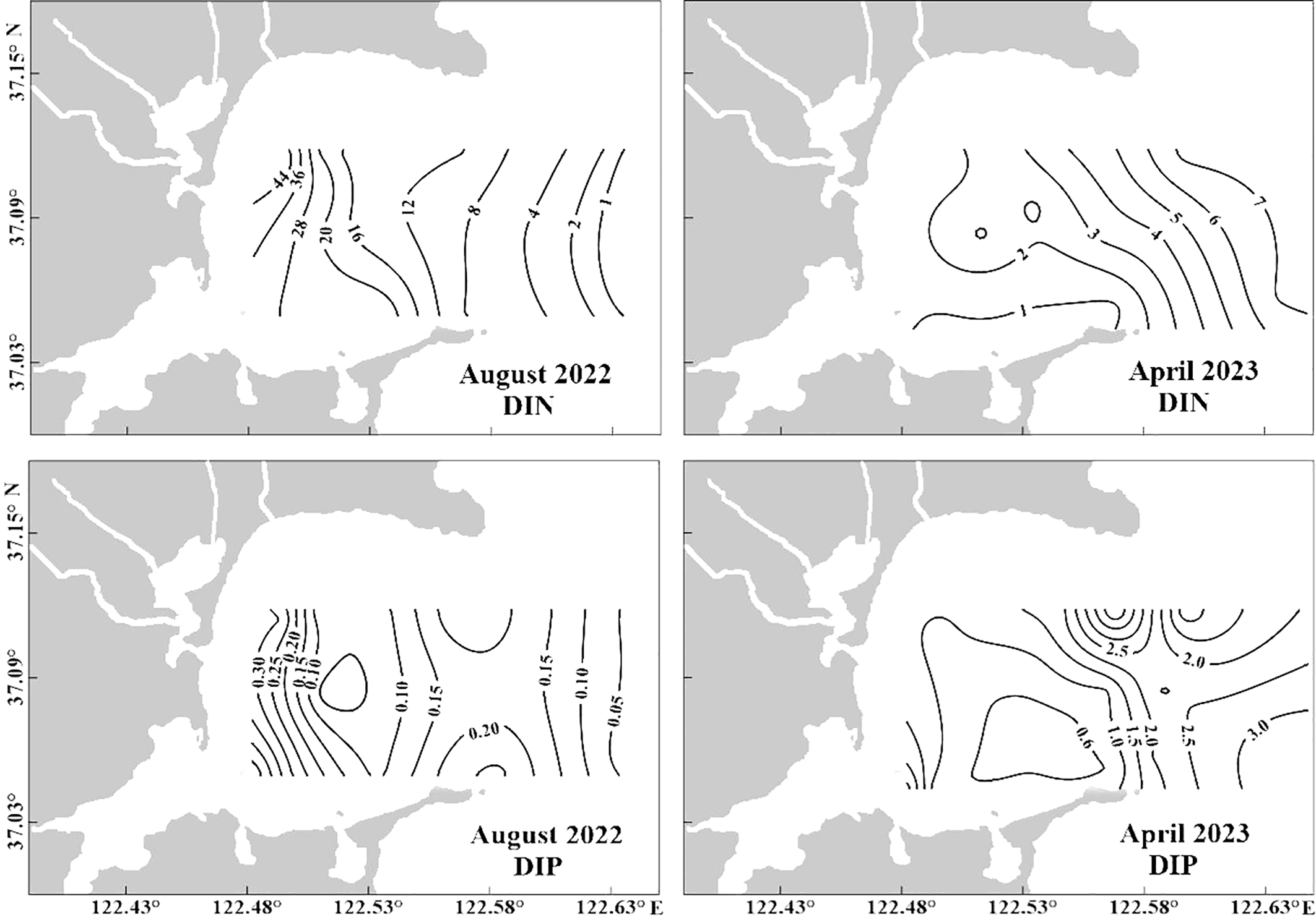 Horizontal distributions of DIN (μM) and DIP (μM) in August 2022 and April 2023 in Sanggou Bay. DIN, dissolved inorganic nitrogen; DIP, dissolved inorganic phosphorus.