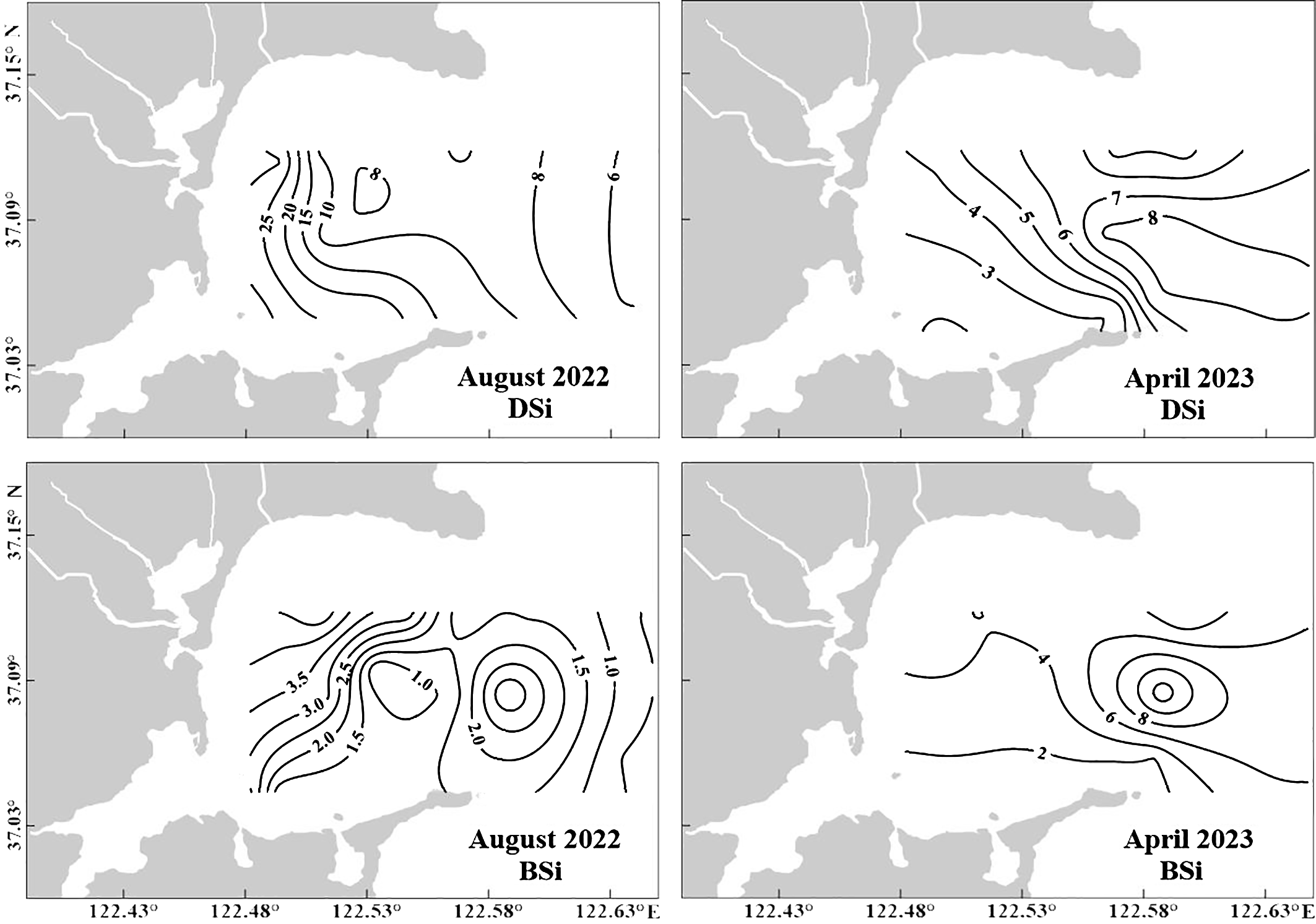 Horizontal distributions of DSi and PBSi in August 2022 and April 2023 in Sanggou Bay.