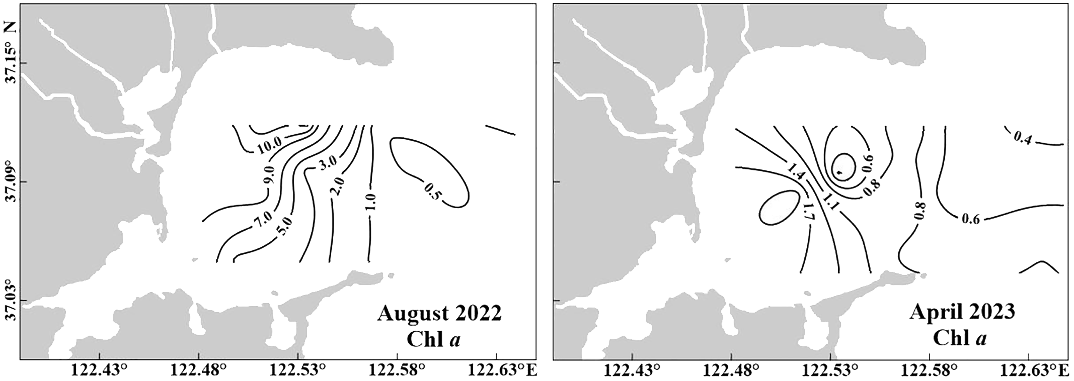 Horizontal distribution of chlorophyll a concentration (Chl a, μg L−1) at the surface water in August 2022 and April 2023.