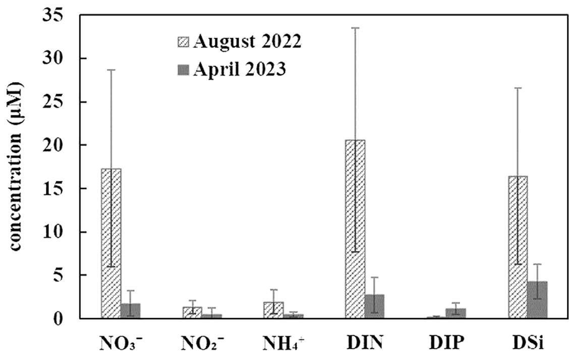 Water temperature and salinity were measured in situ using a WTW MultiLine F/Set3 multi-parameter probe. Each water sample was immediately filtered through a preweighted 0.45 µm pore size cellulose acetate filters (pre-cleaned with hydrochloric acid, pH = 2) into a clean polyethylene bottle and the filtrates were stored at –20°C until they were analyzed. The filtrate was used to measure NO3–, NO2–, NH4+, DIP, and DSi. Dissolved nutrient concentrations were measured in the laboratory using an Auto Analyzer 3 (Seal Analytical), following the methods of Grasshoff et al. (1999). The DIN concentration is the sum of NO3–, NO2–, and NH4+ concentrations. The detection limit was 0.10 μM for NO3–, NO2–, NH4+, DSi, and 0.01 μM for DIP. The analytical precision for NO3–, NO2–, NH4+, DIP, and DSi was < 5%.