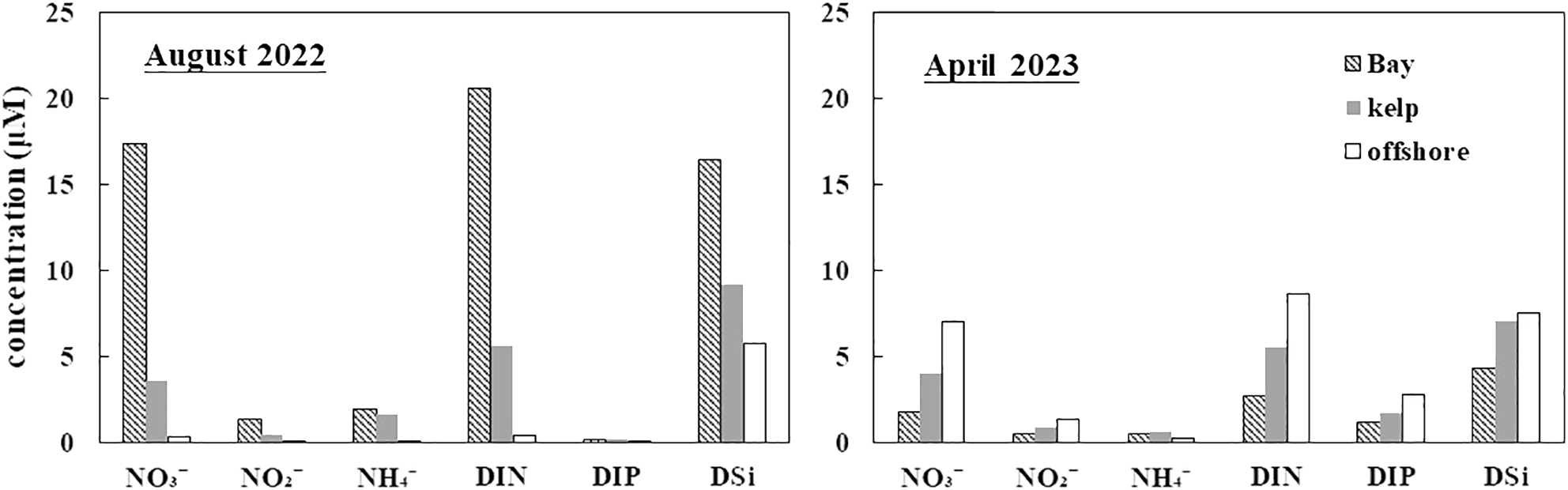 Seasonal variations in nutrient concentrations (μM) in Sanggou Bay during the study period. DIN, dissolved inorganic nitrogen; DIP, dissolved inorganic phosphorus; DSi, dissolved silicate.