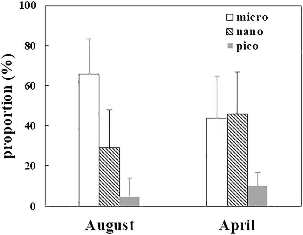 Temporal variations of the proportion of size-fractionated Chl a concentration (%) at surface water of Sanggou Bay in August 2022 and in April 2023.