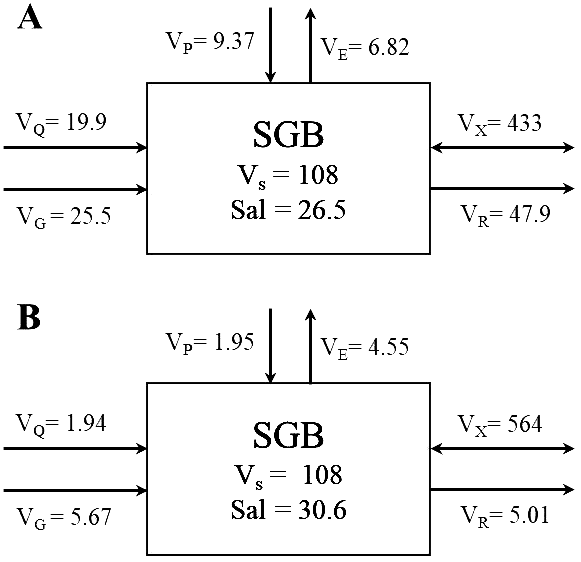 Water and salt budgets for Sanggou Bay (SGB). The numbers (A, B) refer to spring and spring, respectively. Units: water valume, 107 m3; water and salt fluxes, 107 m3 and 107 psu m3 d−1, respectively. VQ, VP, VE, VG, VS, VR, and VX are the mean flow rate of river water, precipitation, evaporation, groundwater, the volume of the system of interest, the residual flow, and the mixing flow between the system of interest and the adjacent system, respectively. Adjacent system: Socn = 29.6 (August) and 30.8 (April).