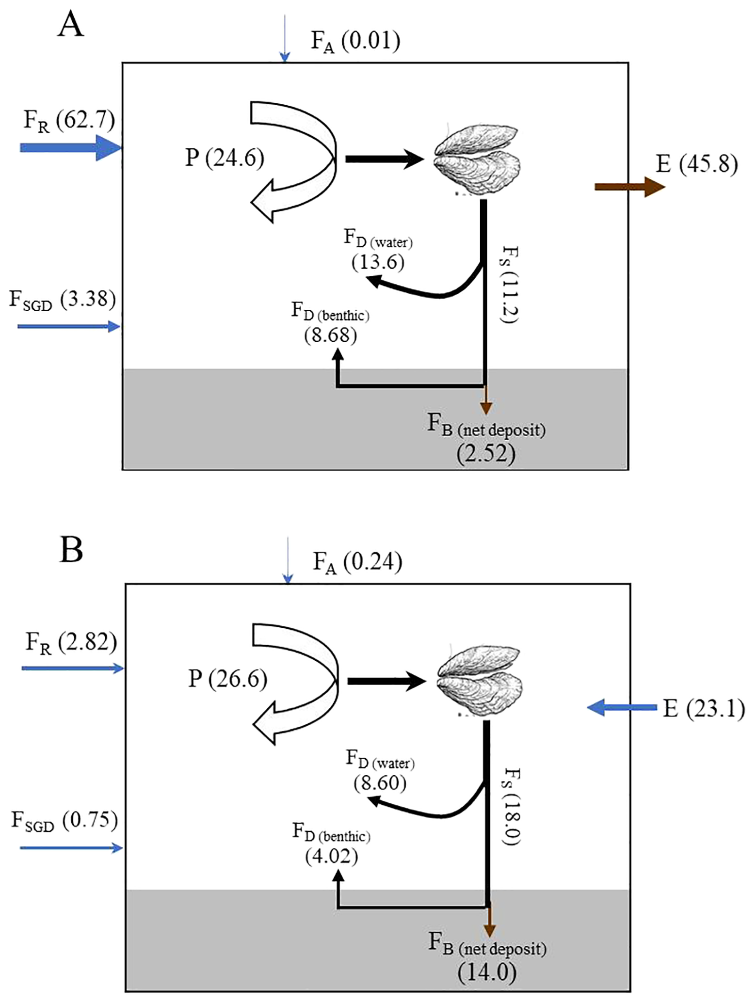 Oysters (C. gigas) and scallops (C. farreri) were the primary suspension bivalves cultured in SGB. Oyster and scallop cultivation involved approximately 1.08 × 109 and 4.47 × 108 individuals, respectively, in the bay (Li, 2019). Based on excretion rates determined in a previous study (Zhou et al., 2002a) for bivalves in Sishili Bay (China), the total DIN and DIP excreted by C. gigas and C. farreri in SGB amounted to 0.13 × 106 mol d–1 and 0.87 × 104 mol d–1, respectively. However, evidence regarding DSi excretion by bivalves is limited (Ray and Fulweiler, 2020). Therefore, the DSi excreted by scallops and oysters was not included in the budget. The nutrients were removed from the bay when the bivalves were harvested. The dry weights of soft tissues and shells for individual C. gigas at harvest were 1.43 g and 70.75 g, and 1.63 g and 12.65 g for C. farreri, respectively. Annually, 80000 t of C. gigas (total dry weight) and 10000 t of C. farreri (total dry weight) are harvested from the bay. The dry weight nitrogen and phosphorus contents of the C. gigas soft tissue were 8.19 and 0.379%, respectively, and in the shell were 0.12 and 62.1 × 10−4% (Zhou et al., 2002b), respectively. The nitrogen content (dry weight) of the C. farreri soft tissue and shells was 12.36% (Zhou et al., 2002b) and 0.14% (Ren, 2014), respectively, and the phosphorus content was 0.839% (Zhou et al., 2002b) and 0.026% (Ren, 2014), respectively. Bivalves are always harvested during summer. Thus, 402 t of nitrogen and 24.9 t of phosphorus were removed from the bay as a consequence of C. gigas and C. farreri harvesting during the wet season (Table 2). A previous study showed that the Si contents of the dried soft tissue and shells of C. gigas and C. farreri were both < 0.01% at harvest (Niu, 2014). Si held in market-size C. gigas and C. farreri was minimal compared to bivalve-mediated enhancements in sediment Si cycling. Therefore, the C. gigas and C. farreri Si content was not included in the budget.