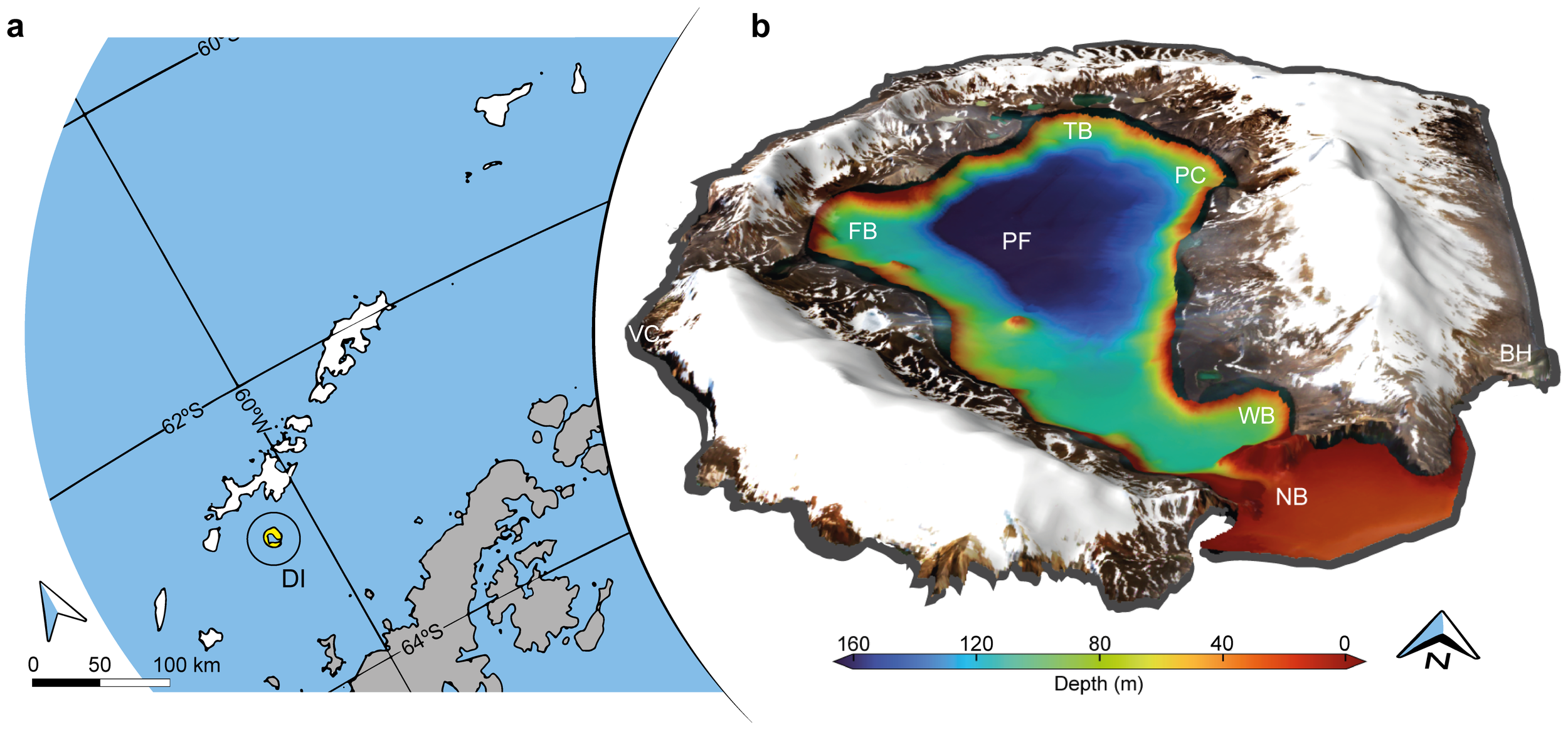 South Shetland Islands archipelago and Deception Island close-up view. (A) South Shetland Islands (highlighted in white) are located north of the West Antarctic Peninsula, with the Drake Passage in the north and the Bransfield Strait in the south. Deception Island (DI) is highlighted in yellow. (B) Sentinel-2 satellite merge with a digital elevation model of DI, displaying Port Foster (PF) bathymetry. VC, Vapor Col; BH, Baily Head; NB, Neptune’s Bellows; PC, Pendulum Cove; TB, Telefon Bay; FB, Fumarole Bay; WB, Whalers Bay.