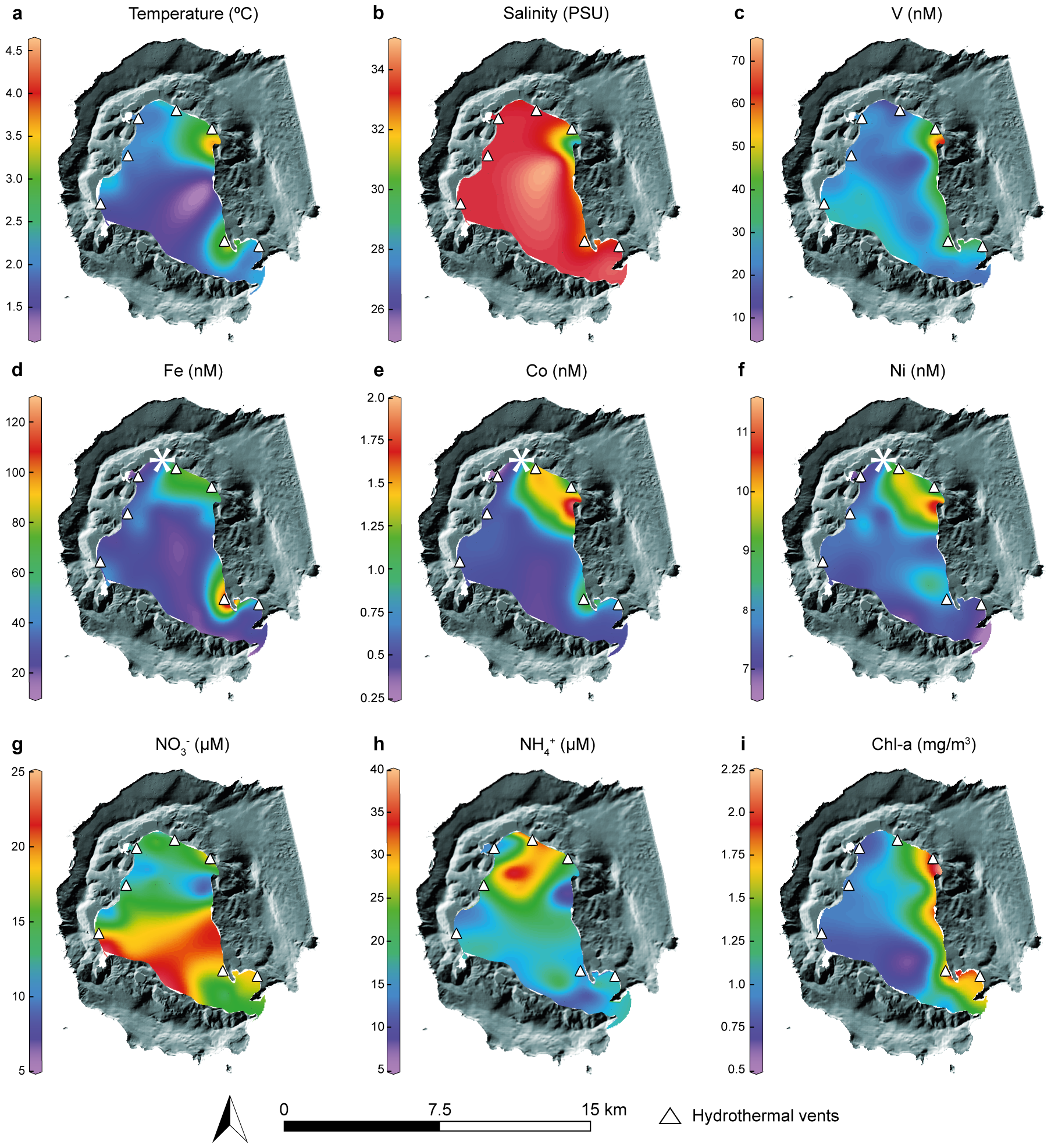 Spatial distribution of thermohaline properties (A, B), most relevant TMs (C, D, E, F), nutrients (G, H) and chlorophyll-a (I) in Port Foster Bay as obtained during the sampling campaigns. White star in Fe (D), Co (E) and Ni (F) indicates a sampling station (Leg 1, St. 1) where high concentrations of those trace metals were obtained (Fe = 361.13 Nm; Co = 3.89 nM; Ni = 17.19 nM). Concentrations observed at the white star were omitted from the interpolation for better visualization.