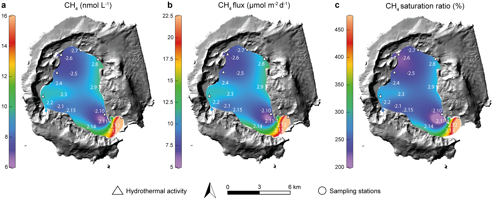 To assess the origin of such gasses in Port Foster, while specific isotopic data about CO2 and CH4 was not analyzed in the present study, information is available on isotopic gas composition in DI, that allows to infer the origin of such gases within the bay. For instance, Kusakabe et al. (2009), while not specifically mentioning δ13C-CH4 values, provide δ13C values for CO2, which range from -5 to -6‰. These values indicate degassing from a mid-ocean ridge basalt (MORB)-type mantle source, suggesting a similar mantle origin for other carbon-containing gases, including CH4. Regarding helium isotopes, Kusakabe et al. shows the existence of high 3He/4He ratios and other noble gas data highlight the significant contribution of mantle-derived helium.