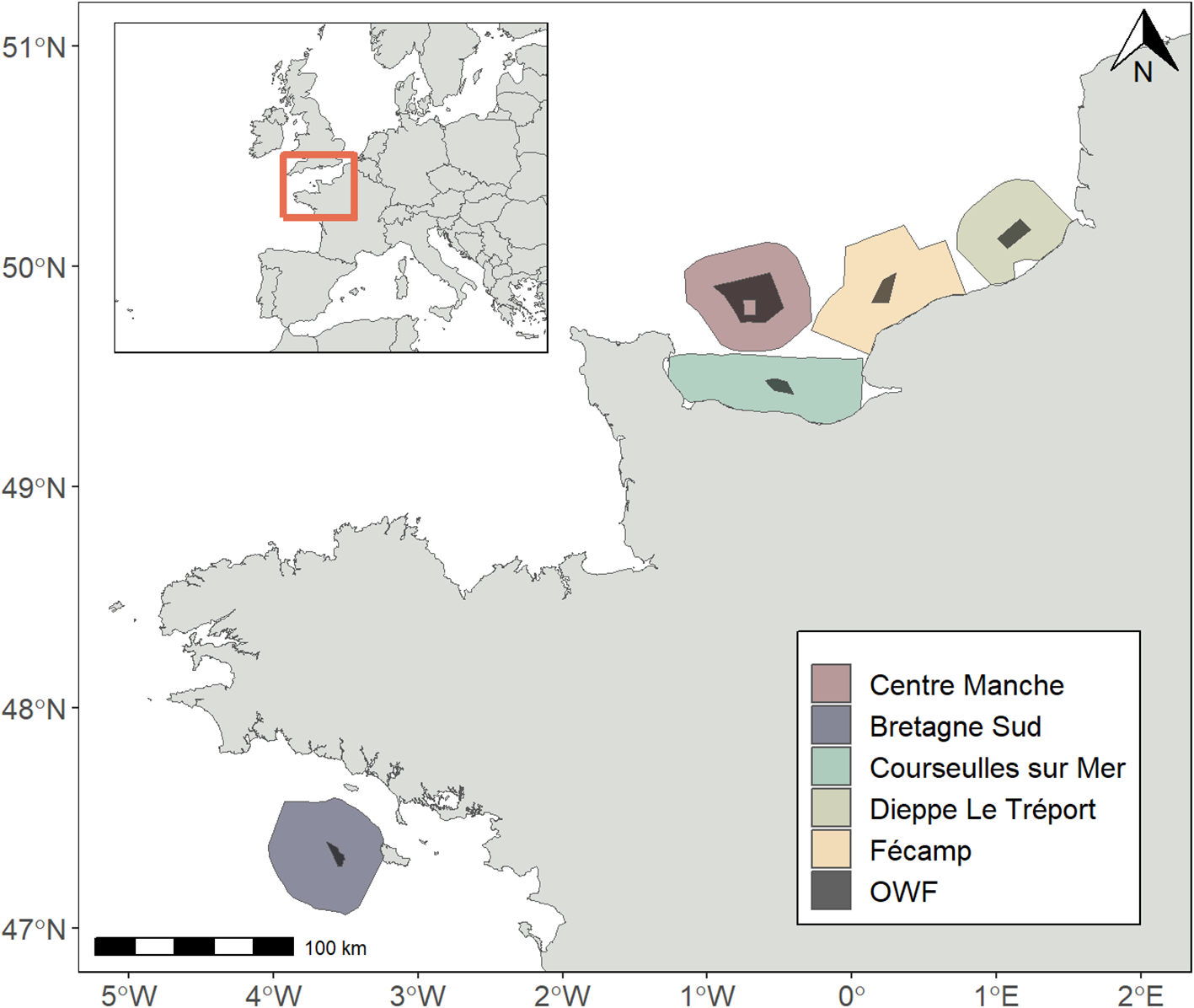 Survey areas around five offshore windfarm (OWF) projects in northwest France.