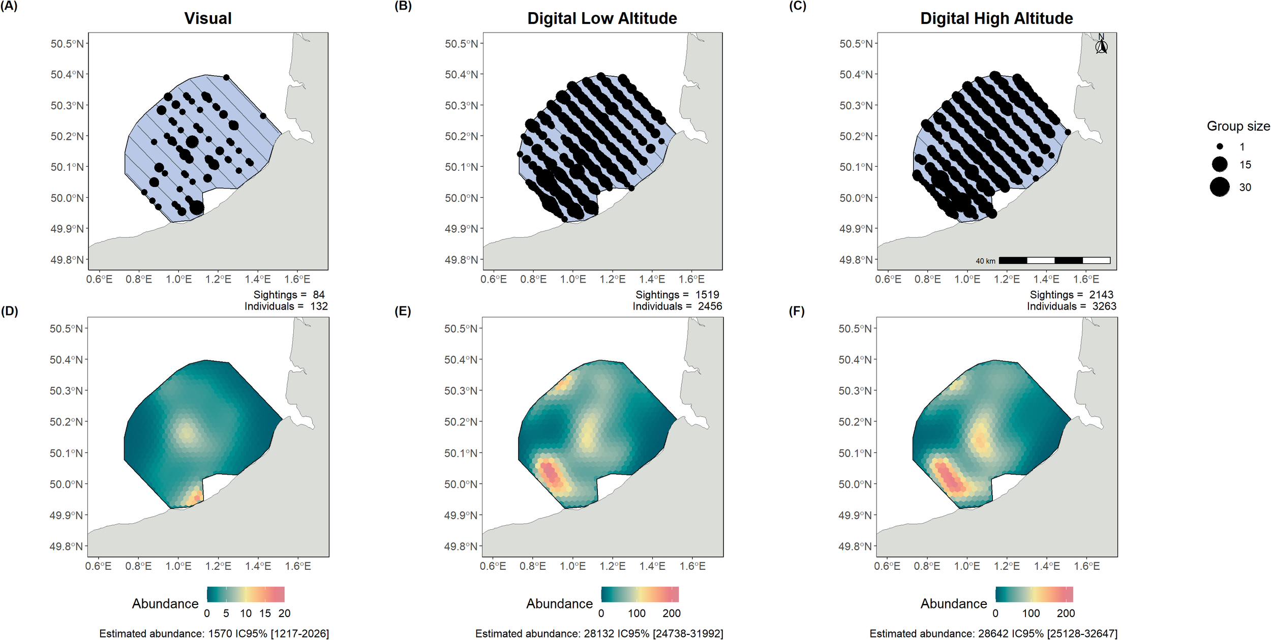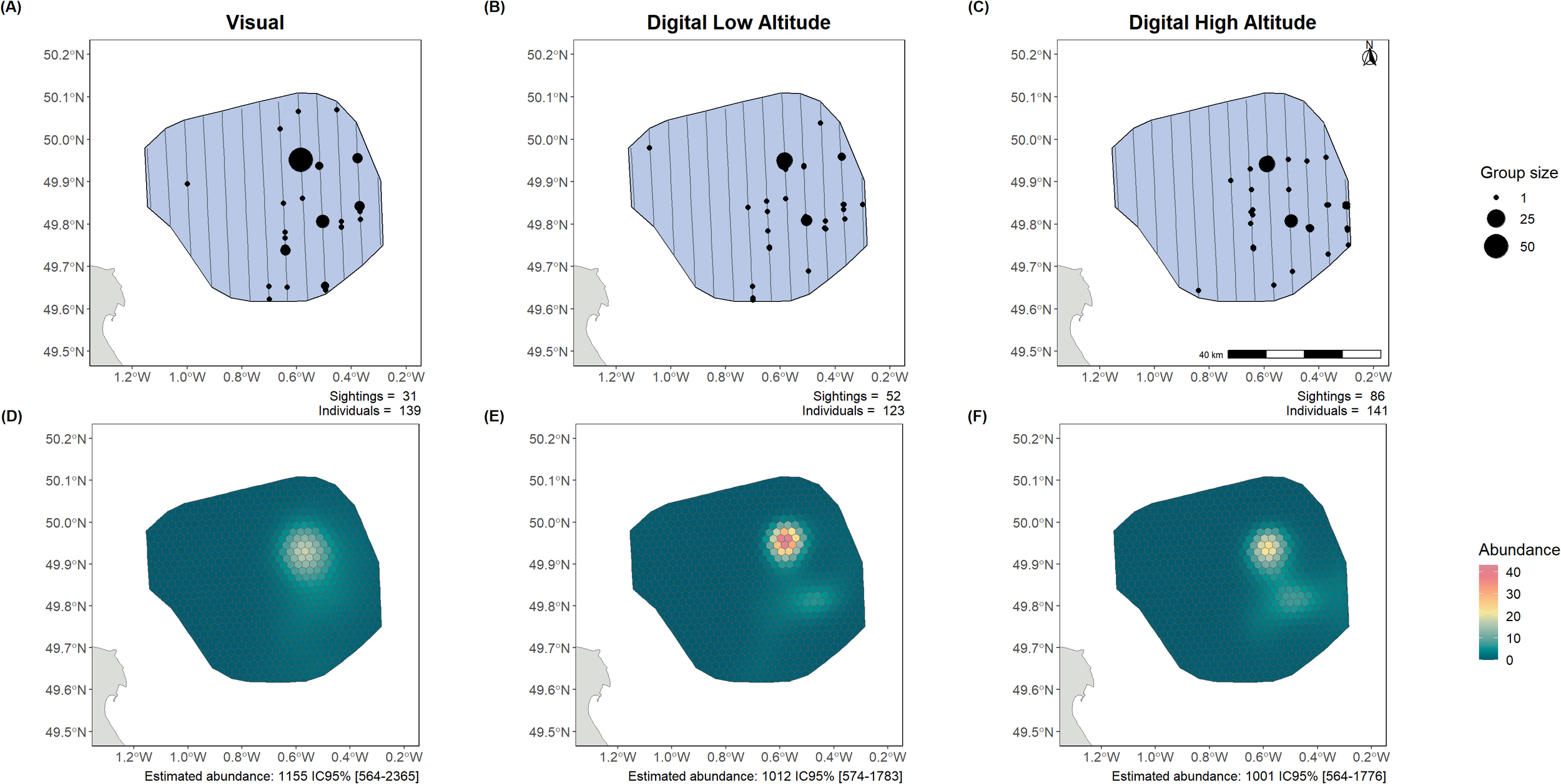 In contrast, for alcids in the English Channel, there was high variation in abundance estimations depending on the data acquisition method (Figure 3). Visual detections were much lower (Figure 3A), with 132 individuals detected, while the digital method at the same altitude detected 2,456 individuals (Figure 3B). As a result, abundance estimates between visual and digital data differed by a factor of 18, with no overlap in confidence intervals (1,570 individuals estimated CI 95% [1,217-2,026] with visual data; 28,132 individuals estimated CI 95% [24,738-31,992] with digital low-altitude data and 28,642 individuals estimated CI 95% [25,128 – 32,647] for digital high-altitude survey). However, the estimates obtained from the two digital methods in the intercalibration survey showed consistent abundance estimates and similar patterns of distribution.